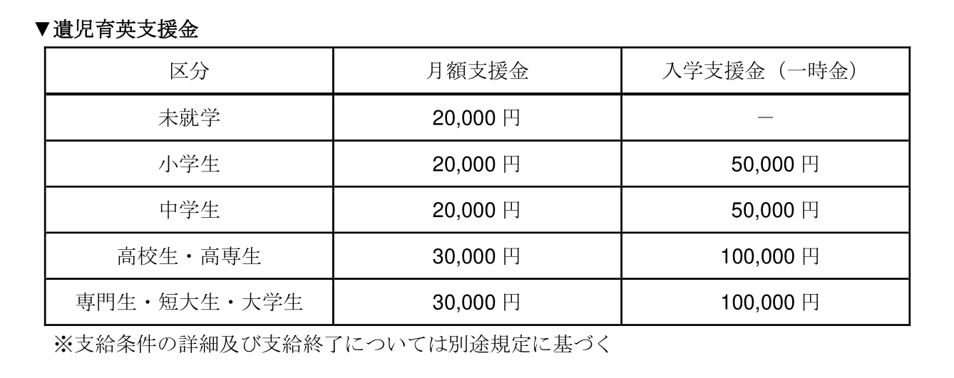 18歳(大学生は22歳)以下の子を扶養していた従業員が亡くなった場合、学業を奨励し、遺族家庭の経済的な負担を軽減するために、「遺児育英支援金」(最大642万円)を支給いたします。支援金は在学区分に応じて、毎月支給される月額支援金と入学時に支給される入学支援金で構成されます。