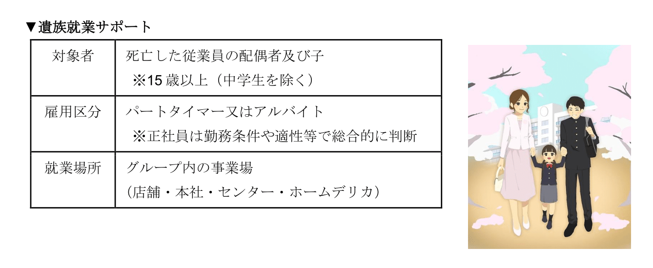 亡くなった従業員の配偶者や子がベルクグループでの就業を希望する場合、可能な限り支援を行い、生活の安定を図ります。居住地や就業希望条件を考慮し、店舗やセンター等、グループ内の事業場での就業が可能となるよう支援を行います。