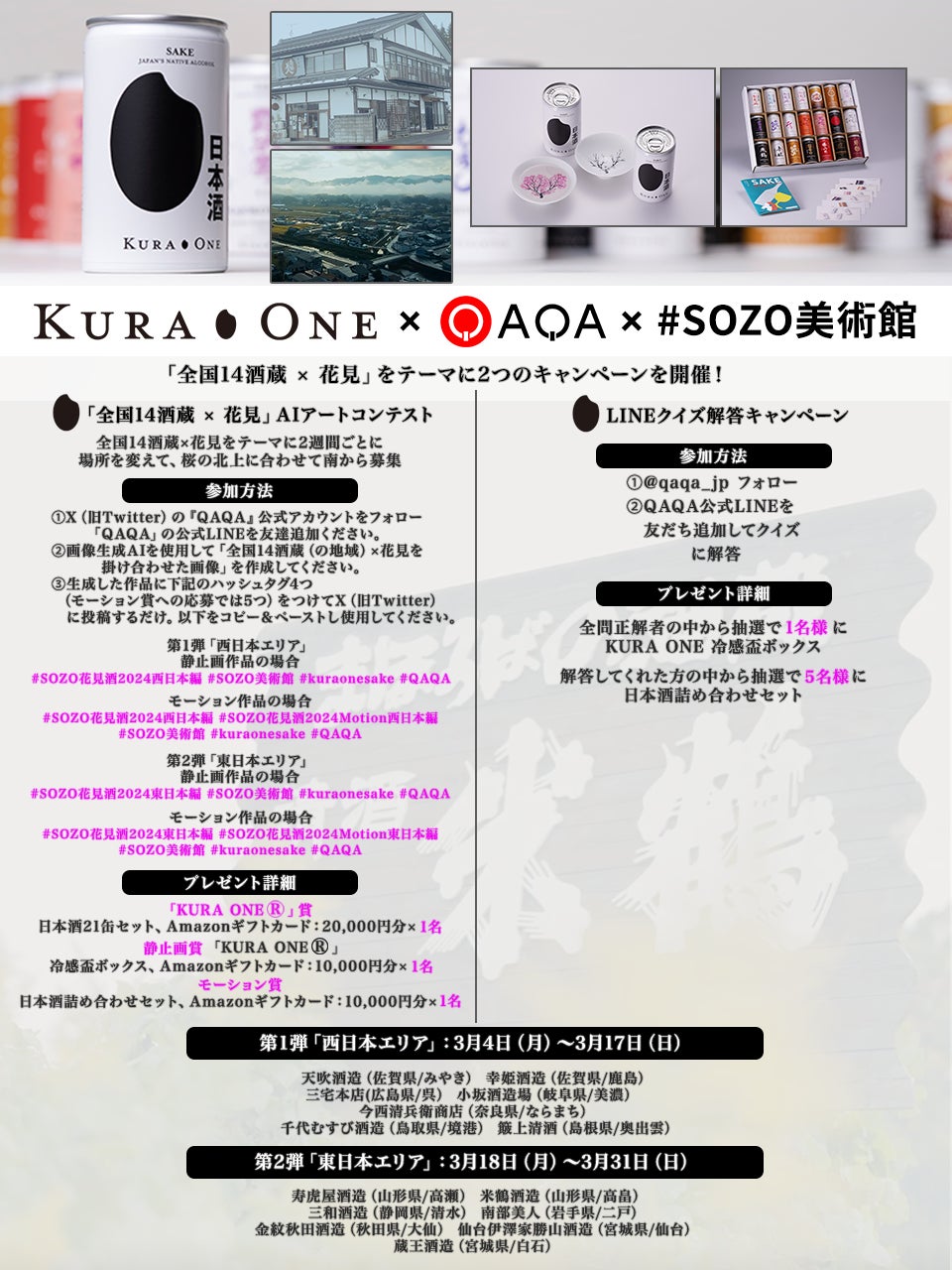 クイズ動画SNS『QAQA(カカ)』を開発中の株式会社BLOCKSMITH&Co. (本社:東京都港区、代表取締役社長CEO 真田 哲弥、以下「BLOCKSMITH」)は、日本酒ブランド「KURA ONE🄬」を提供するアイディーテンジャパン株式会社(本社:東京都目黒区、代表取締役:澤田且成、以下「同社」)と、AIアート作品をSNSで一般公募する新しいプラットフォーム「#SOZO美術館」を運営する株式会社海馬(東京都港区/代表 北村勝利)の3社合同で、「全国14酒蔵 × 花見」をテーマとしたLINEクイズ解答&AIアート投稿キャンペーンを開催します。