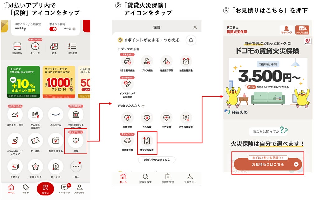 なお、本保険は、「d払い」アプリの「保険アイコン」から簡単にお申込みが可能です。