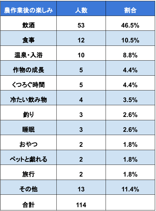 「農作業を終えた後に楽しみにしていることは何ですか?」(n=114)と質問したところ、「飲酒」と回答した人が最も多く全体の46.5%、次いで「食事」が10.5%を占めました。