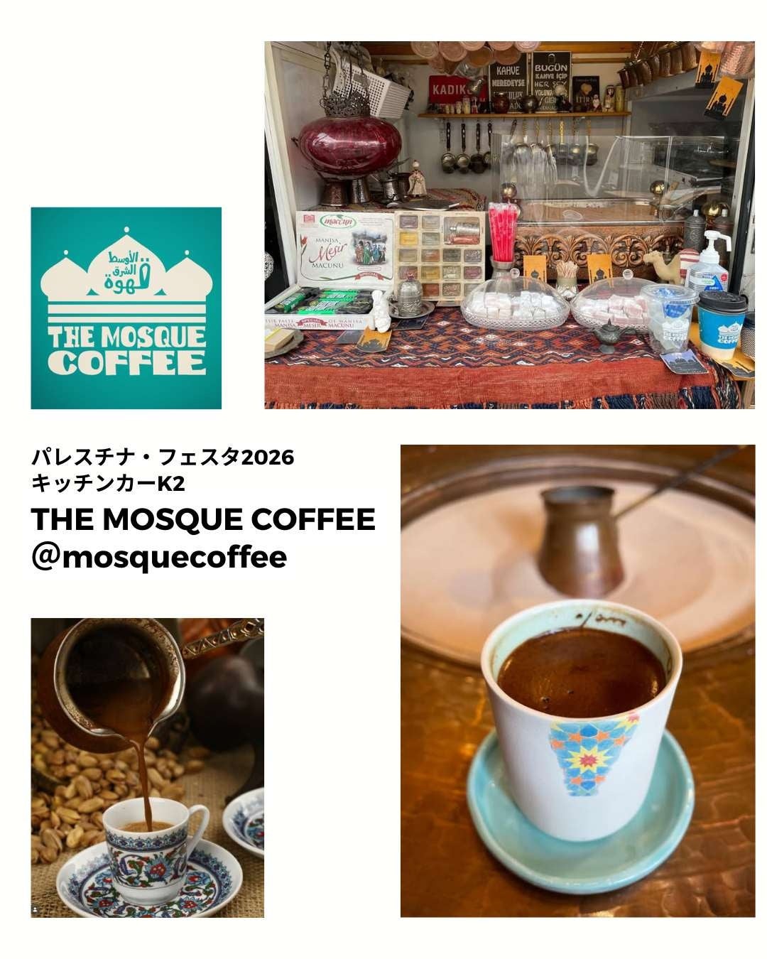 また、中東やパレスチナのオリーブオイル、石鹸、刺繍製品などのマーケットコーナーやパレスチナを代表する料理を提供するモラードさんやトルココーヒー専門店のザ・モスク・コーヒーさんも出店されます。当団体からは、ガザ応援グッズや書籍などを販売予定です。どうぞお楽しみに!