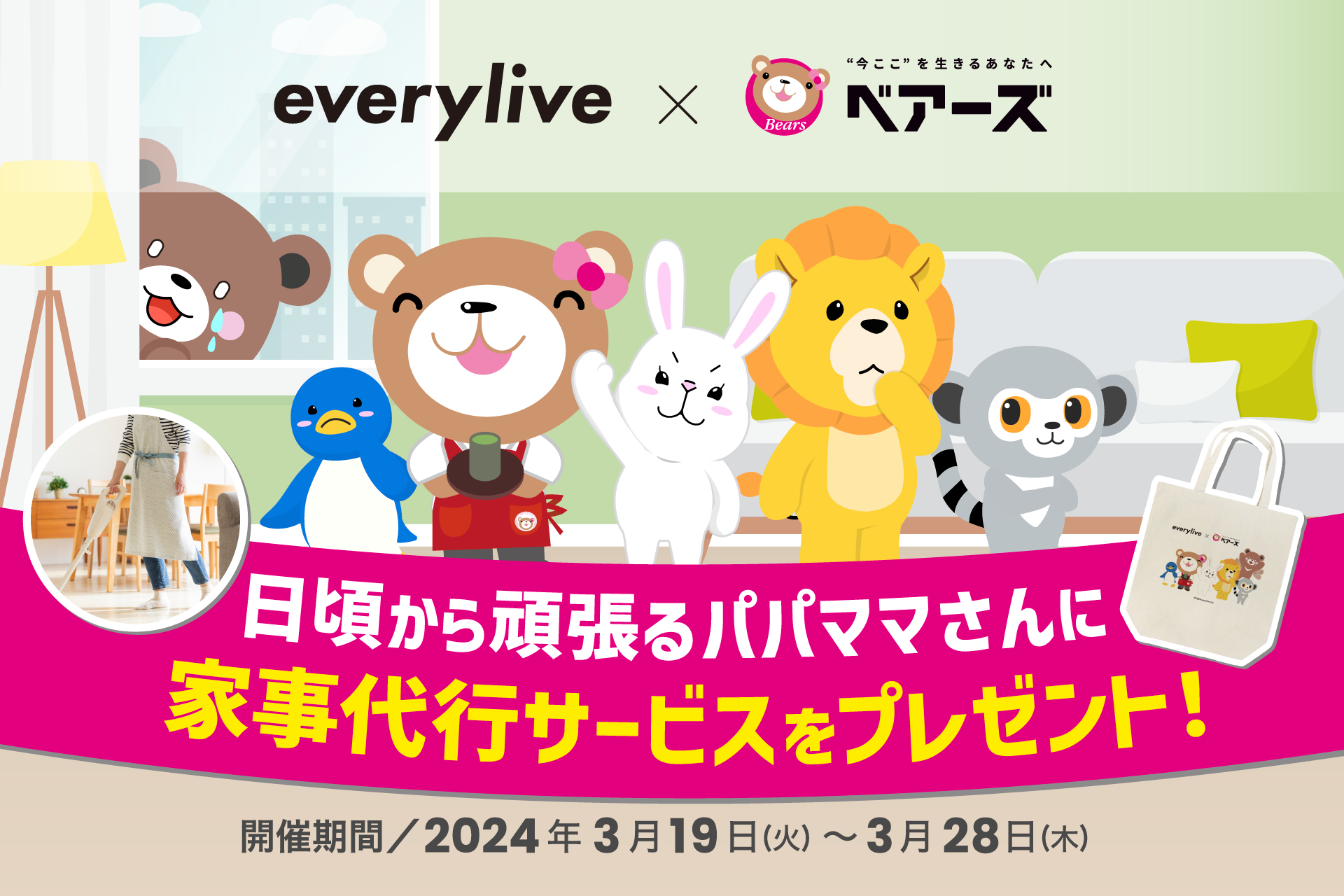 エブリライブでは、「ベアーズ」の家事代行サービスが体験できるギフトやコラボグッズなどがもらえるアプリ内イベントを開催いたします。