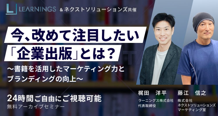 ベンチャーなど成長企業がなぜ「企業出版」に取り組んでいるのか、出版社のラーニングス株式会社と共催で、WEBマーケティングにも好影響を与える、ブランディングや、マーケティング力の向上につながる、書籍の活用方法をお伝えします。
