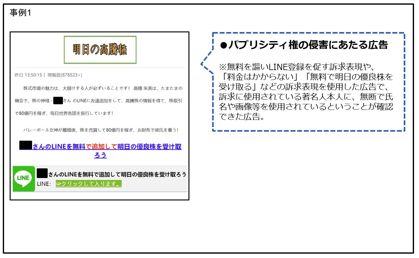 a. パブリシティ権の侵害にあたる広告(著名人の名前や画像等を無断利用していることが明確に判明している広告)