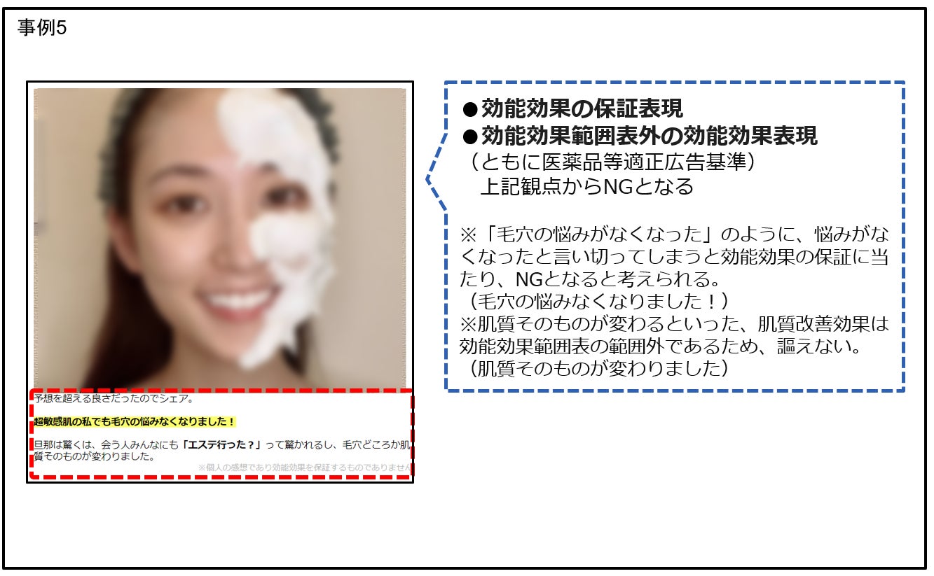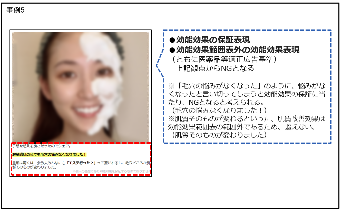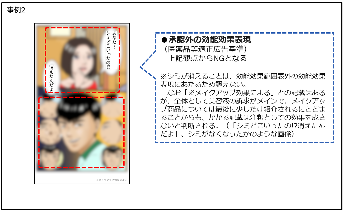 例10:化粧品(薬用化粧品含む)に該当する商材について、その他謳うことのできない効果があるかのような表現。皮膚のたるみを解消する、ポツポツをケアする、細胞を含めて若返らせる、アンチエイジング効果がある、などの表現。