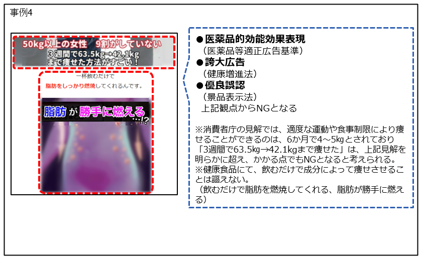 例:必ず痩せることができる、脂肪便を排出させる、代謝を上げてくれる、脂肪を燃焼させる、痩せ体質になれる、2週間で13.1kgの減量、BA画像との組み合わせで過度に痩せるような表現