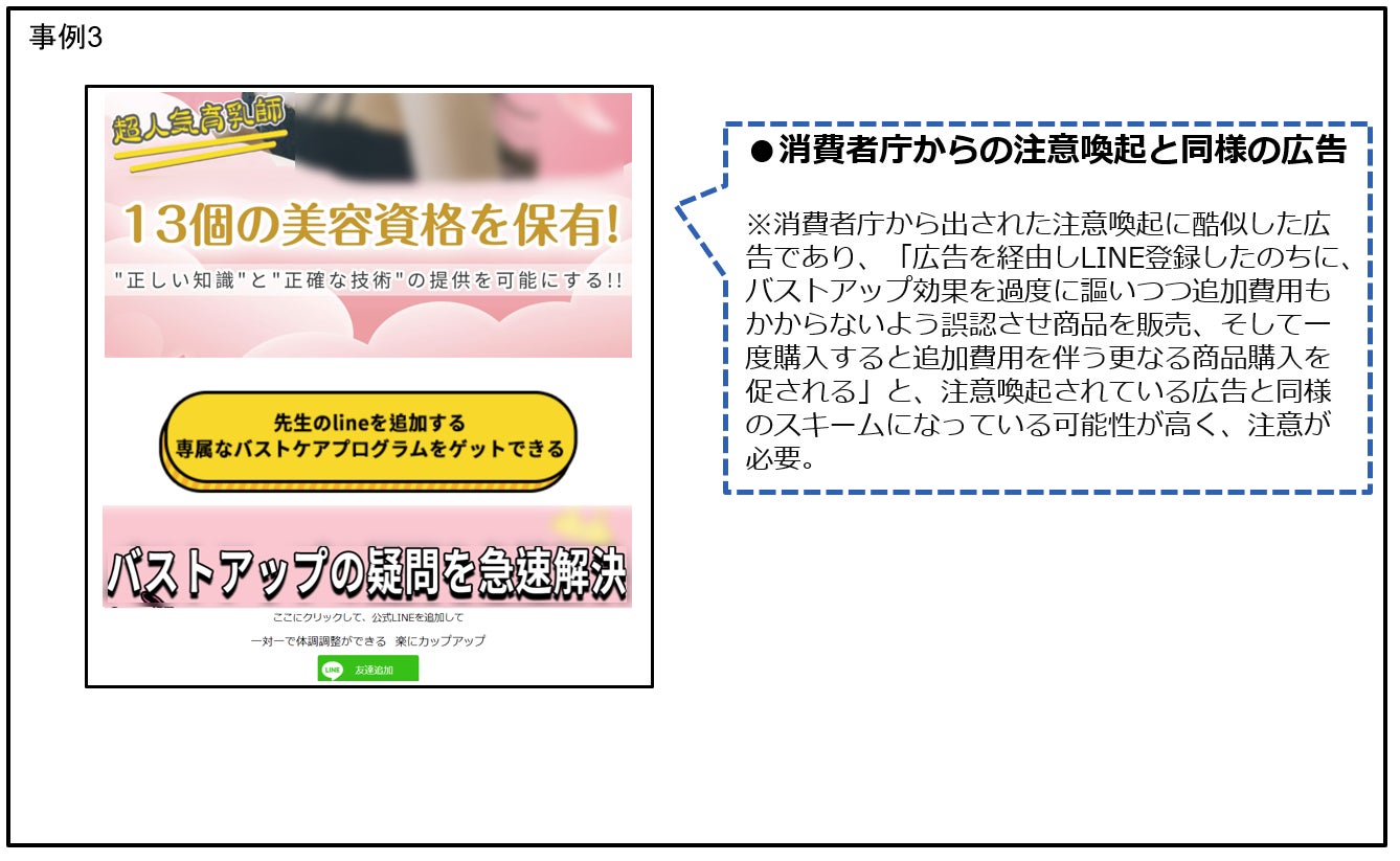 b. 過度の痩身効果もしくはバストアップ効果、並びに追加費用がかからない旨を謳い、LINE登録を勧誘する広告(消費者庁が注意喚起している内容に酷似した広告)