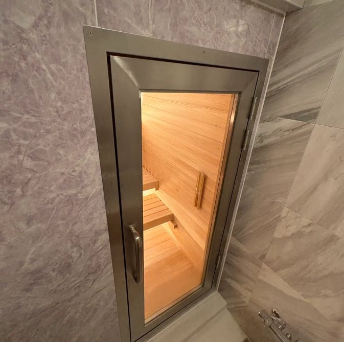 特に近年では、ユニットバスとの連携や、浴室内にサウナを設置したいというご要望が増えており、そのような環境においては、シャワー室からの防水対応や扉にも高い気密性、そして長期使用に耐えうる耐久性が求められます。ステンレス扉はこうした条件に極めて適した素材であり、湿気や水気にさらされる環境下でも変形しにくく、清潔な状態を保ちやすいという特長があります。