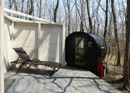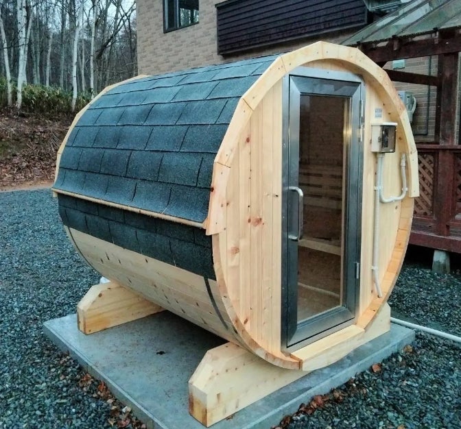 雪や雨にも強く、木製に比べて耐久性が高いため、屋外用のボックスタイプやバレルサウナにオプションとして追加するのに適しています。