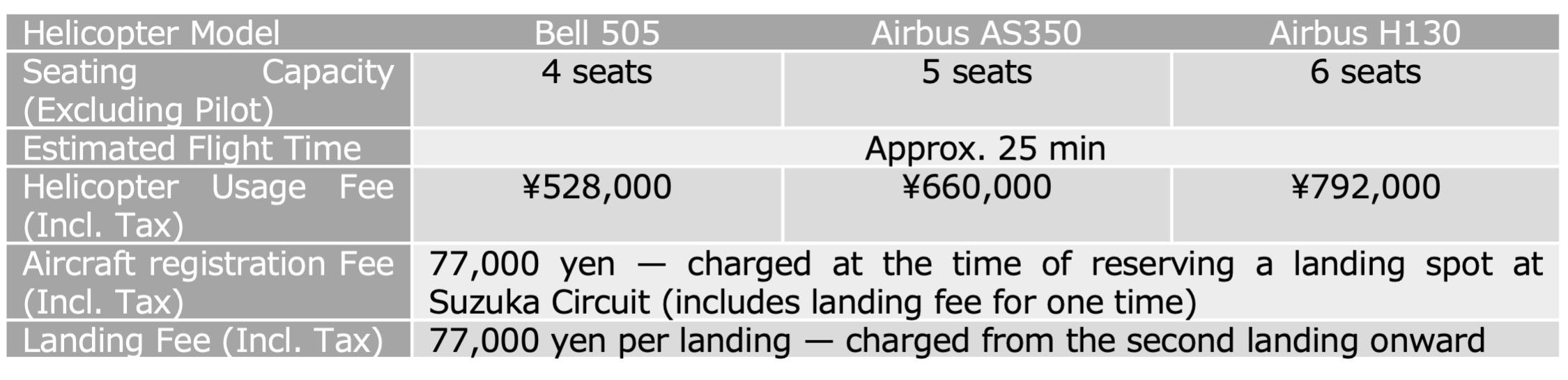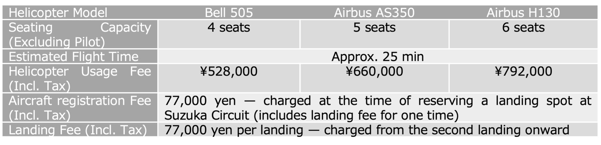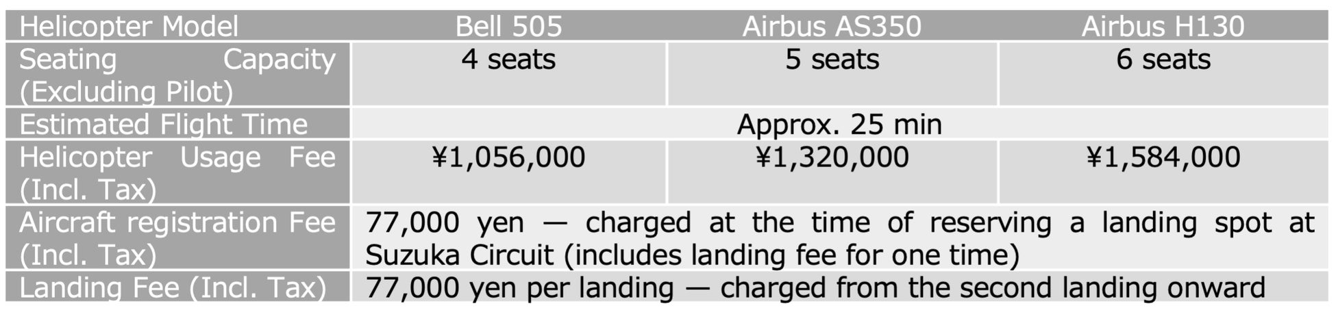 Helicopter Transfers to and from Suzuka Circuit Now Open for Reservations