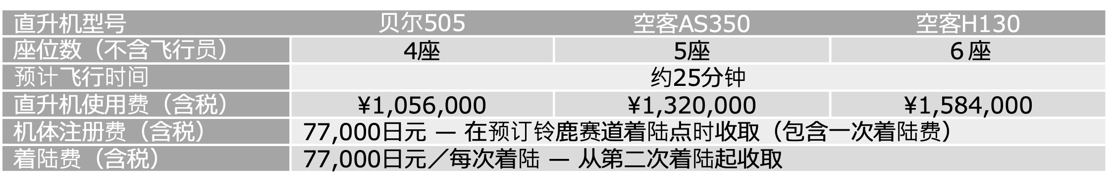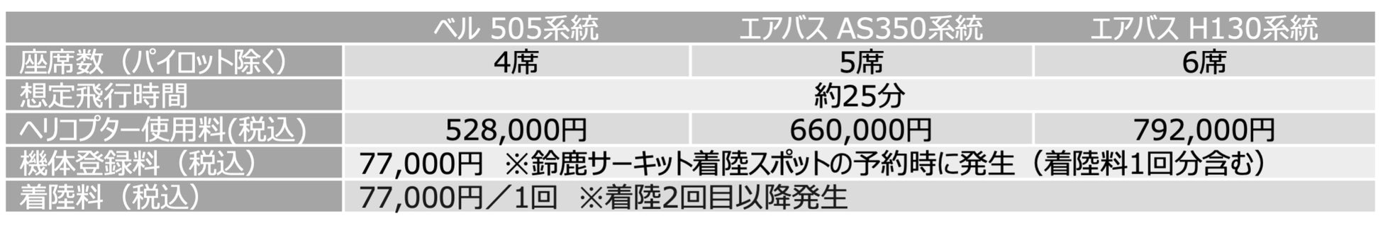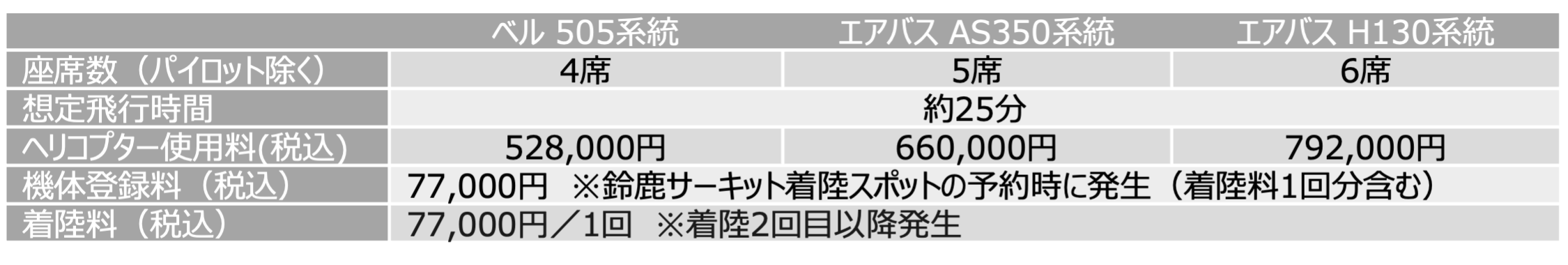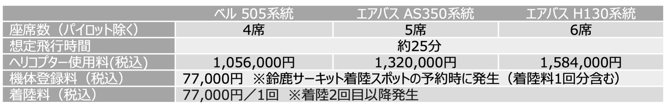 • 例年グランプリ開催の1ヶ月前に鈴鹿サーキットの着陸スポットの予約受付が開始され、離着陸時間が確定いたします。当社への予約段階では希望時間のリクエストを受け付けますが、確約するものではございません。