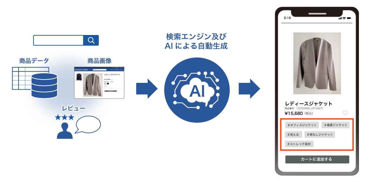 商品データとユーザーのサイト内行動データを基に、商品に関連性が高く検索頻度の高いキーワードのハッシュタグを自動生成する機能です。