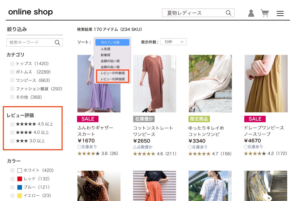 検索結果画面でレビュー評価順やレビュー件数を表示できるため、ユーザーはサイト内で自分に合った情報を絞り込みながら、他のユーザーのレビューを参考にして効率的に商品の購入検討が行えます。