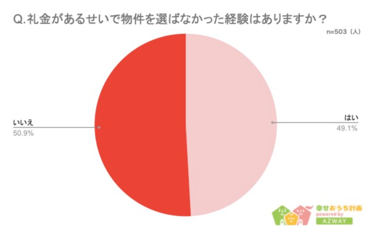 また、「礼金のせいで物件を選ばなかった経験があるか」について聞いたところ、「はい」が247人(49.1%)、「いいえ」が256人(50.9%)という結果に。7割以上の人が礼金を負担に思っていると同時に、約半数の人が実際に「礼金が理由で物件を選ばなかった」経験を持っていることがわかりました。礼金の有無は、賃貸探しにおいて大きなポイントになると言えるでしょう。