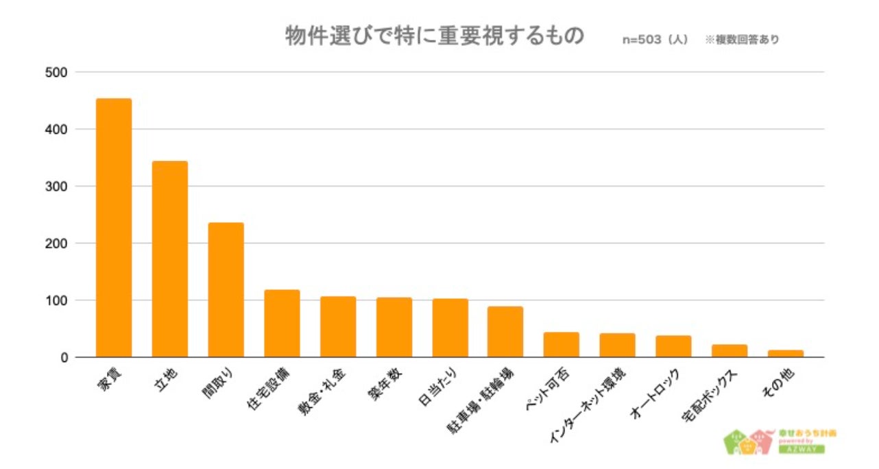 立地や間取り、住宅設備など、日々の生活を快適に過ごす上で欠かせないものが上位にランクインする一方、圧倒的得票数を獲得した「家賃」や5位の「敷金・礼金」のようにお金に関する項目が上位にランクインしており、終わりの見えない物価高騰が続く中、少しでも支出を減らしたいと考えている人が多いことがわかりました。
