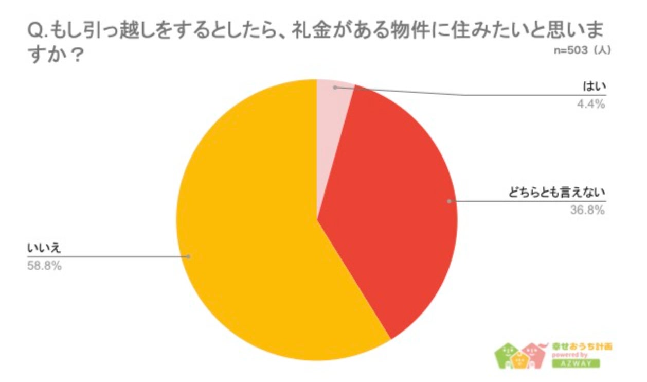10代から60代以上までの回答者503人に「もし引っ越しをするなら礼金ありの物件に住みたいか」について聞いたところ、「はい」と答えた人は22人で4.4%、「どちらとも言えない」が185人で36.8%、「いいえ」が296人で58.8%という結果になりました。礼金ありの物件に住みたいと思っている人はわずか4%となっており、多くの人が礼金がないほうが良いと思っていることがわかります。
