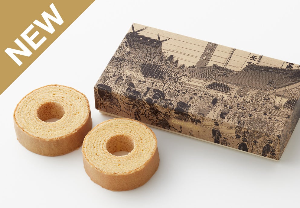 木の年輪を活かした意匠の店舗には工房を併設。バームクーヘンの中央に生クリームとカスタードクリームをたっぷり詰めた「バームクーヘンロール」は職人が一つひとつ工房で仕上げる店舗限定の新商品です。また、繊細な甘さの和三盆糖を使った「バームクーヘンmini 和三盆」には明治時代の水天宮を描いた石版画をパッケージに使用。この地で長く親しまれるよう願いをこめた一品です。どうぞご期待ください。