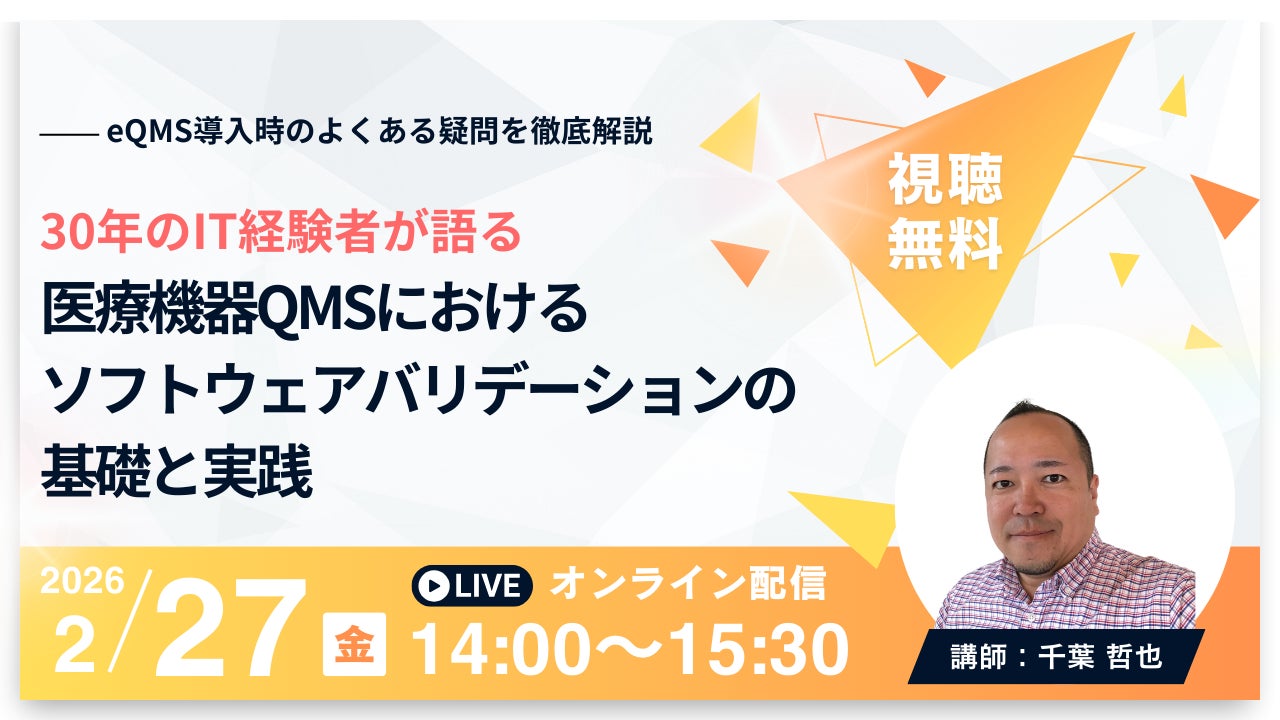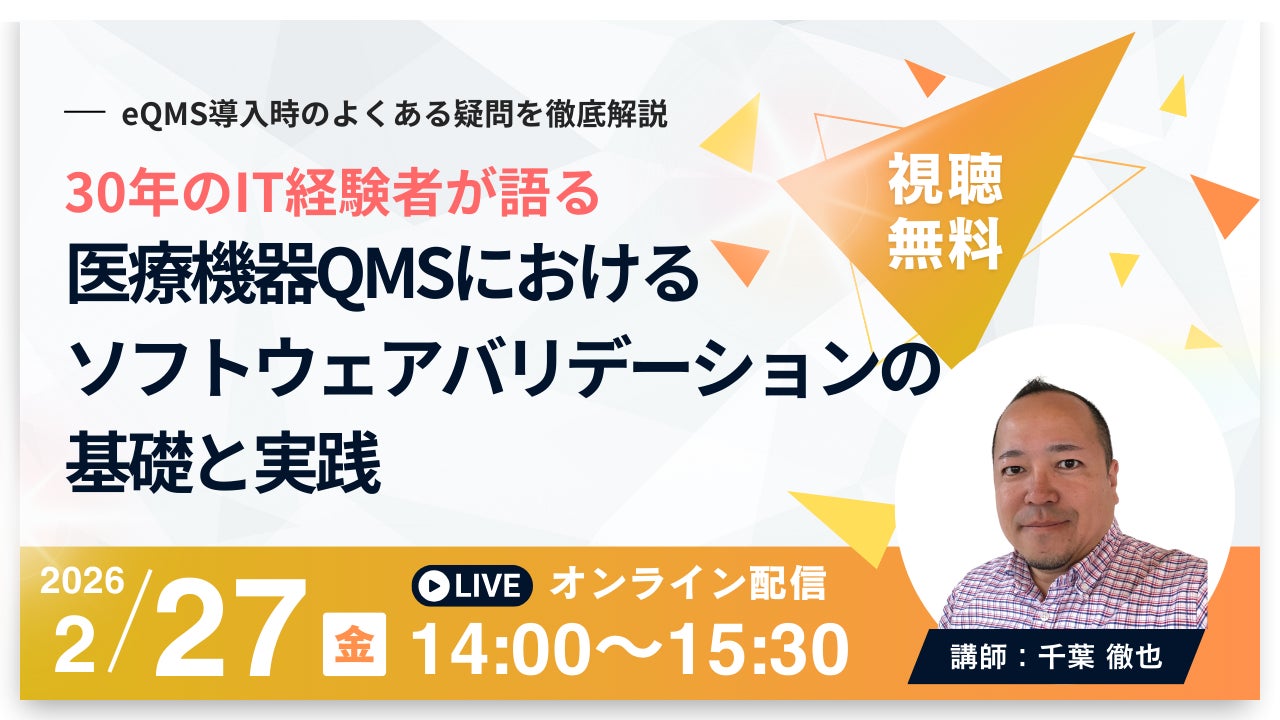 株式会社Berry(本社:東京都台東区、代表取締役:中野裕士)は、医療機器QMSにおけるソフトウェアバリデーション(CSV)の基礎から実践までを解説する無料オンラインセミナー「【30年のIT経験者が語る】医療機器QMSにおけるソフトウェアバリデーションの基礎と実践 ~eQMS導入時のよくある疑問を徹底解説~」を、2026年2月27日(金)に開催します。
