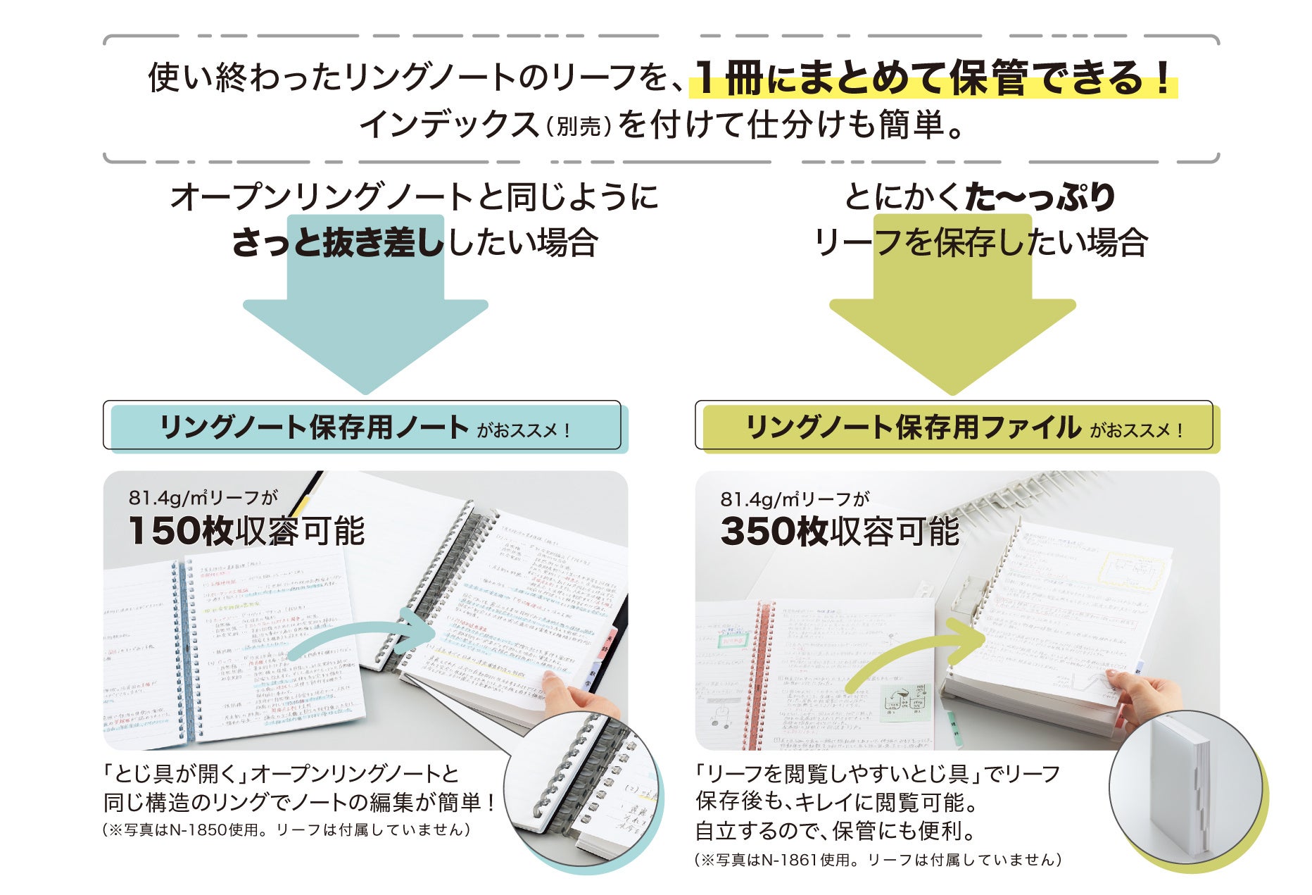 オープンリングノートは2009年のツイストリング・ノート発売以来、サイズやカラーバリエーションを豊富に展開し、多くのお客様にご愛顧いただいております。ご利用いただいているお客様からご要望が多い「大容量収納タイプ」の商品を、リーフを150枚収納可能な「保存用ノート」と、350枚収納可能な「保存用ファイル」としてラインアップいたします。