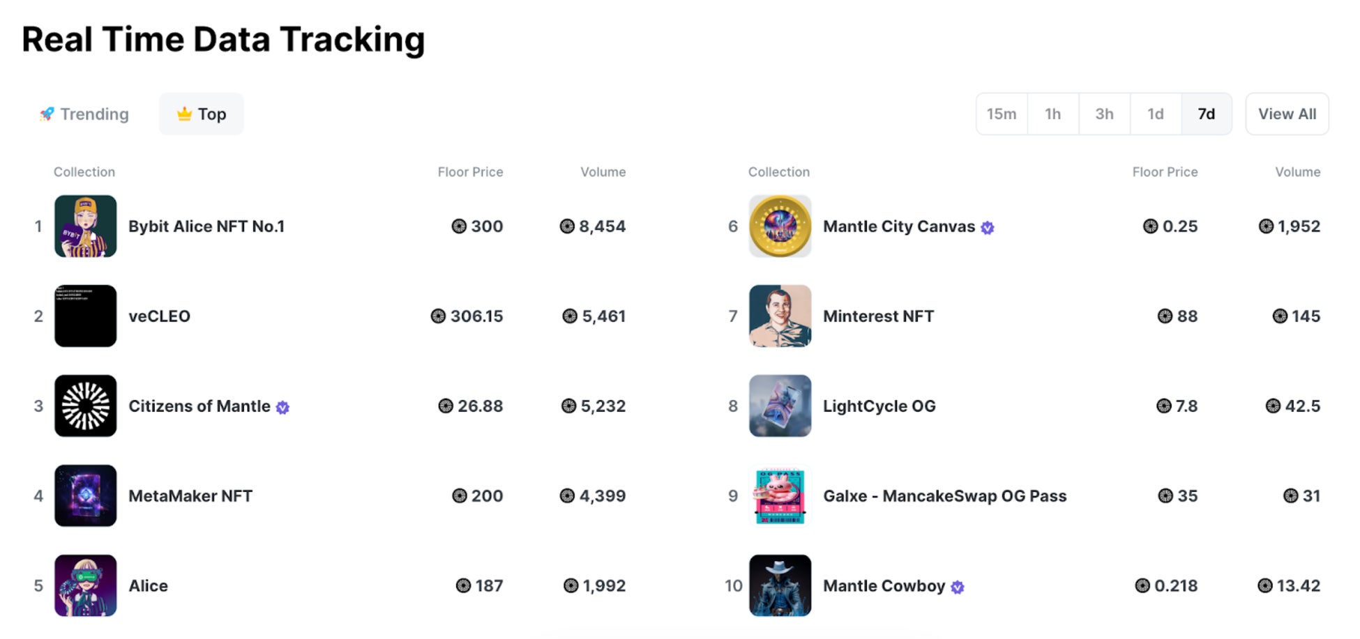 KeyNFTとして各NFTにユーティリティが付与されることで、価格が上昇し、取引量が増加するといったユースケースも確認され、Alice NFTシリーズは2のコレクションがMantle Network上で週間取引量TOP5にランクインしています。