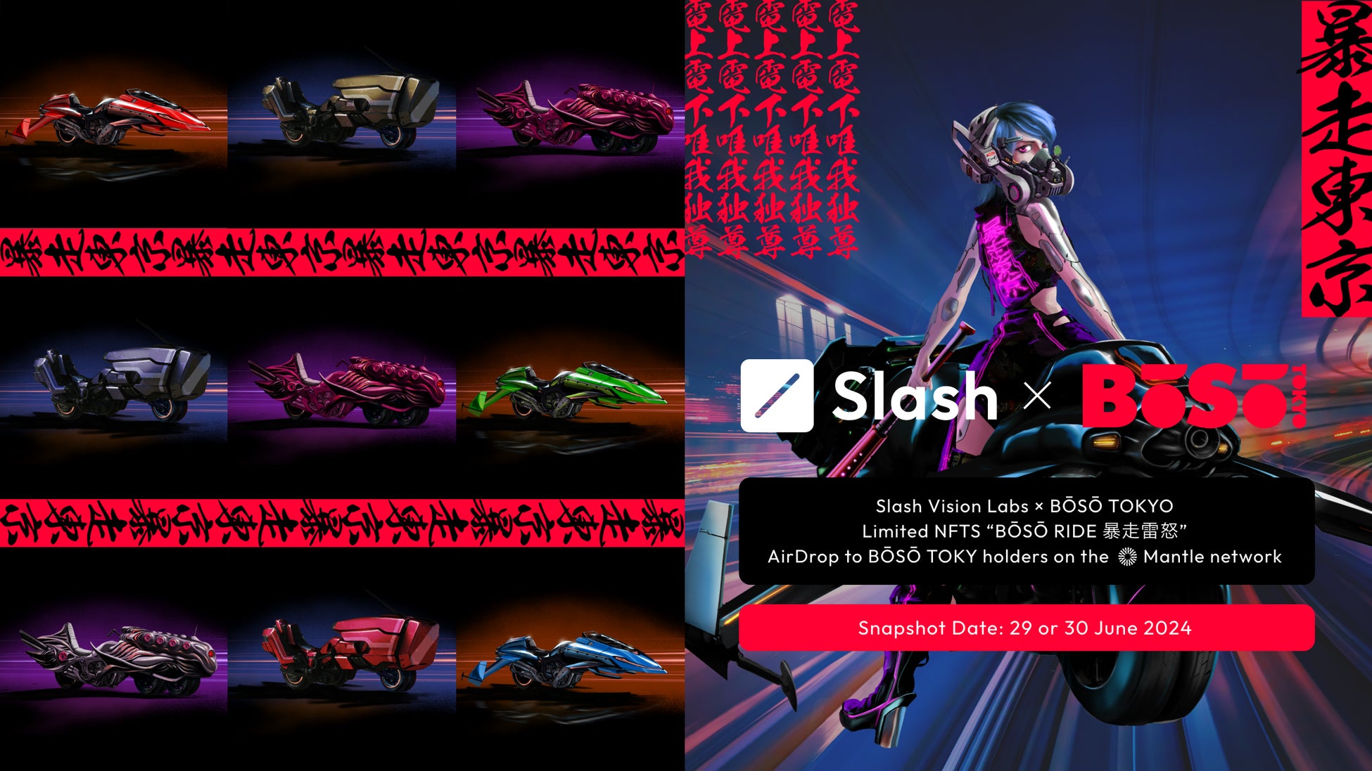 Slash Vision Labsは、サイバーSF×暴走族カルチャーをテーマにした日本発のNFTプロジェクト「 BŌSŌ TOKYO -暴走東京-」とのKeyNFTコラボレーションを通じ、Slash Vision Portal上でのユーティリティが付与されたNFT「BŌSŌ RIDE 暴走雷怒」が、BŌSŌ TOKYO NFTホルダーを対象に2024年7月3日にエアドロップされることをお知らせいたします。また、これを記念して2024年6月29日21時からBŌSŌ TOKYO DiscordにてAMAを開催いたします。