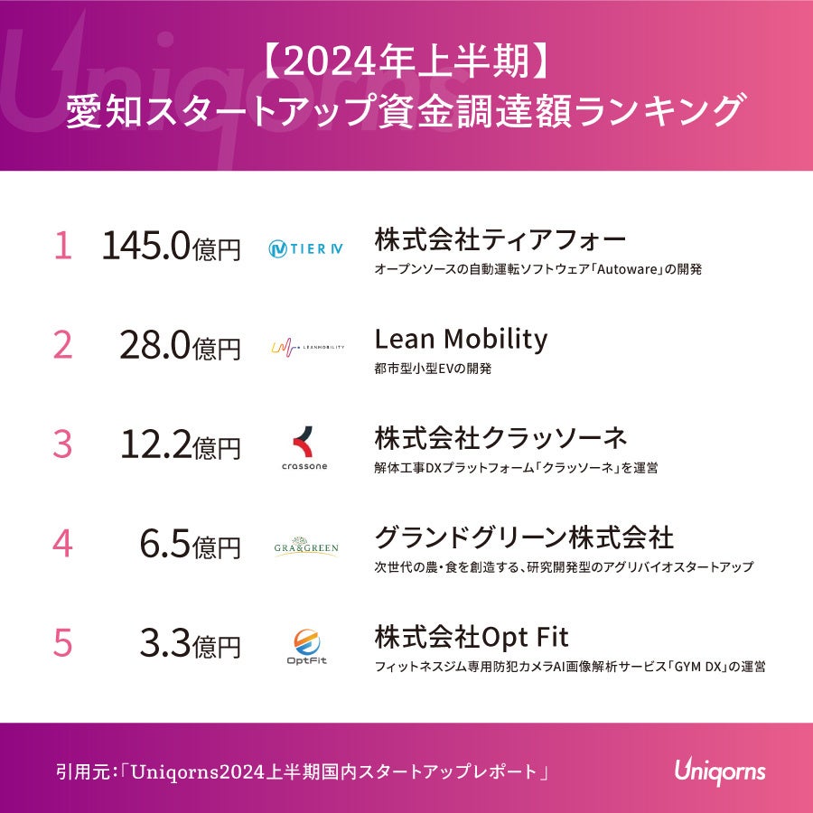 国内最大級のスタートアップメディア「Uniqorns(ユニコーンズ)」が2024年上半期の愛知スタートアップ資金調達状況をランキング形式で発表