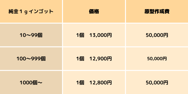 例)1グラム10個製造の場合、1個あたりの商品価格14,300円より(税込み)、当日金販売価格(税込み)を引いた差額のみとなります。仮に相場が9,800円(税込み)だとすると、14,300−9,800円の4,500円(税込み)で製造することが可能です。10個ですと45,000円(税込み)です。