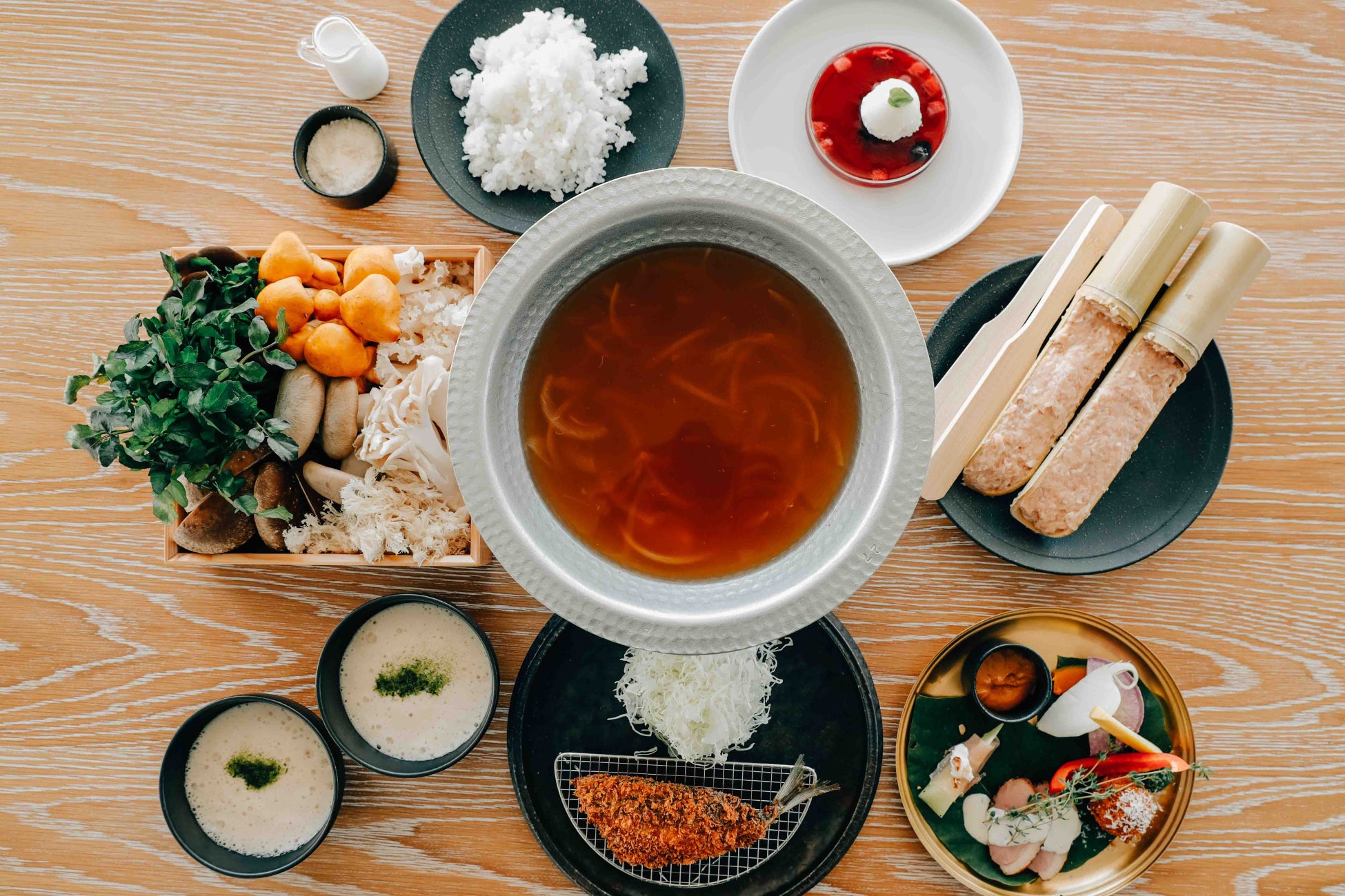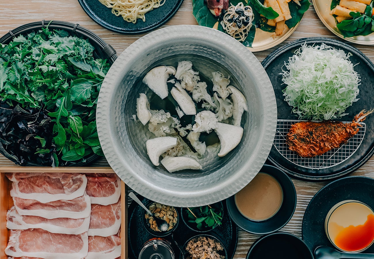 濃厚でまろやかな牛テール白湯スープに、香り豊かな10種のオーガニックハーブを合わせた身体に優しいしゃぶしゃぶ。ケールや長ネギ、キノコなど季節の野菜とともに、とろけるような木更津牛A5肩ロースをお楽しみいただけます。旨みが凝縮されたスープの〆には、コク深い白湯ラーメンを。