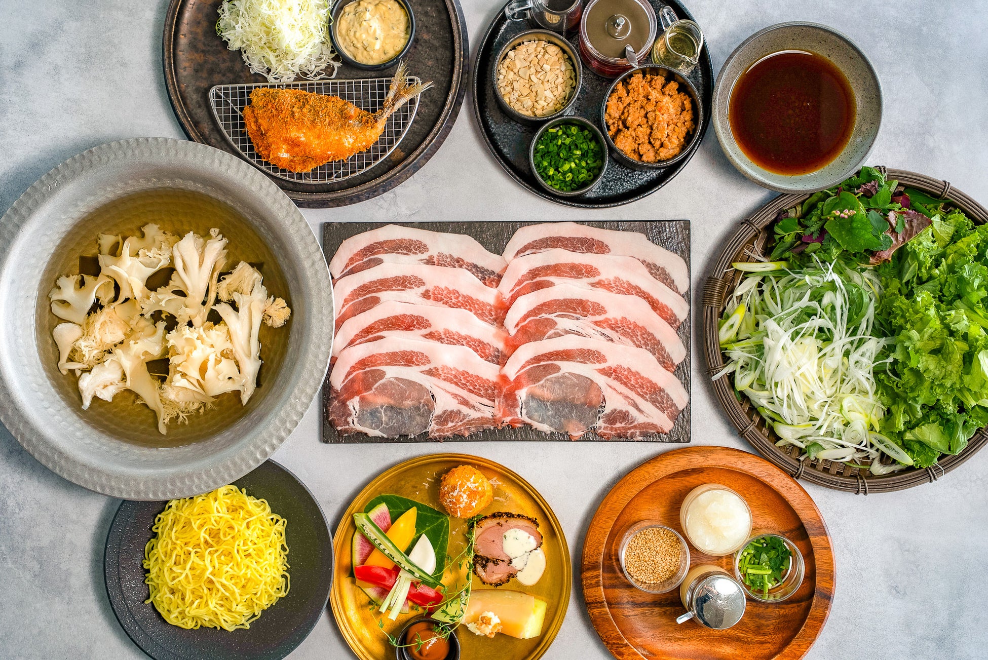 上質な肉質を楽しめる千葉県産の白姫ポークを「苗目ファーム」などから届くフレッシュなハーブ、真っ白なキノコとともにご堪能ください。最後は、麺に胡麻だれやお好みの具材をプラスしてオリジナルの坦々麺を作ってお召し上がりください。