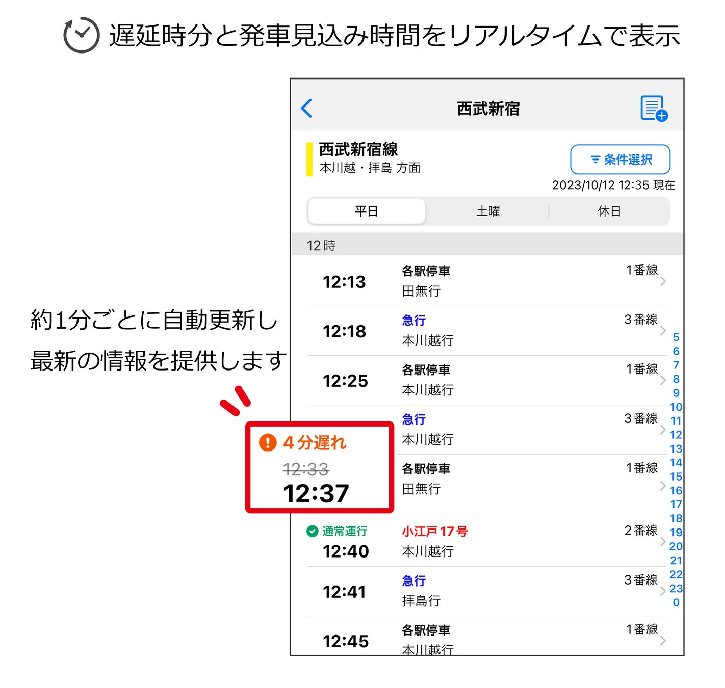 そして今回、本連携により西武鉄道全駅のリアルタイムな運行状況も時刻表にて確認いただけるようになりました。時刻表機能から西武鉄道の駅を選択すると、当日の列車に遅れが生じている場合は遅延時分が「〇分遅れ」と表示され、合わせて発車時刻も遅延時分が反映された時刻に修正されます。このリアルタイムな運行状況は約1分ごとに自動更新され、画面を手動で更新する手間もなく常に最新の情報が提供されます。