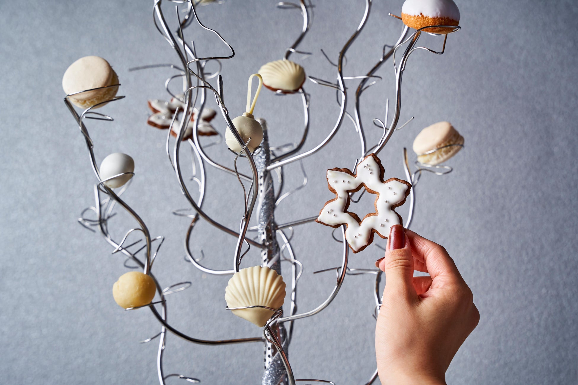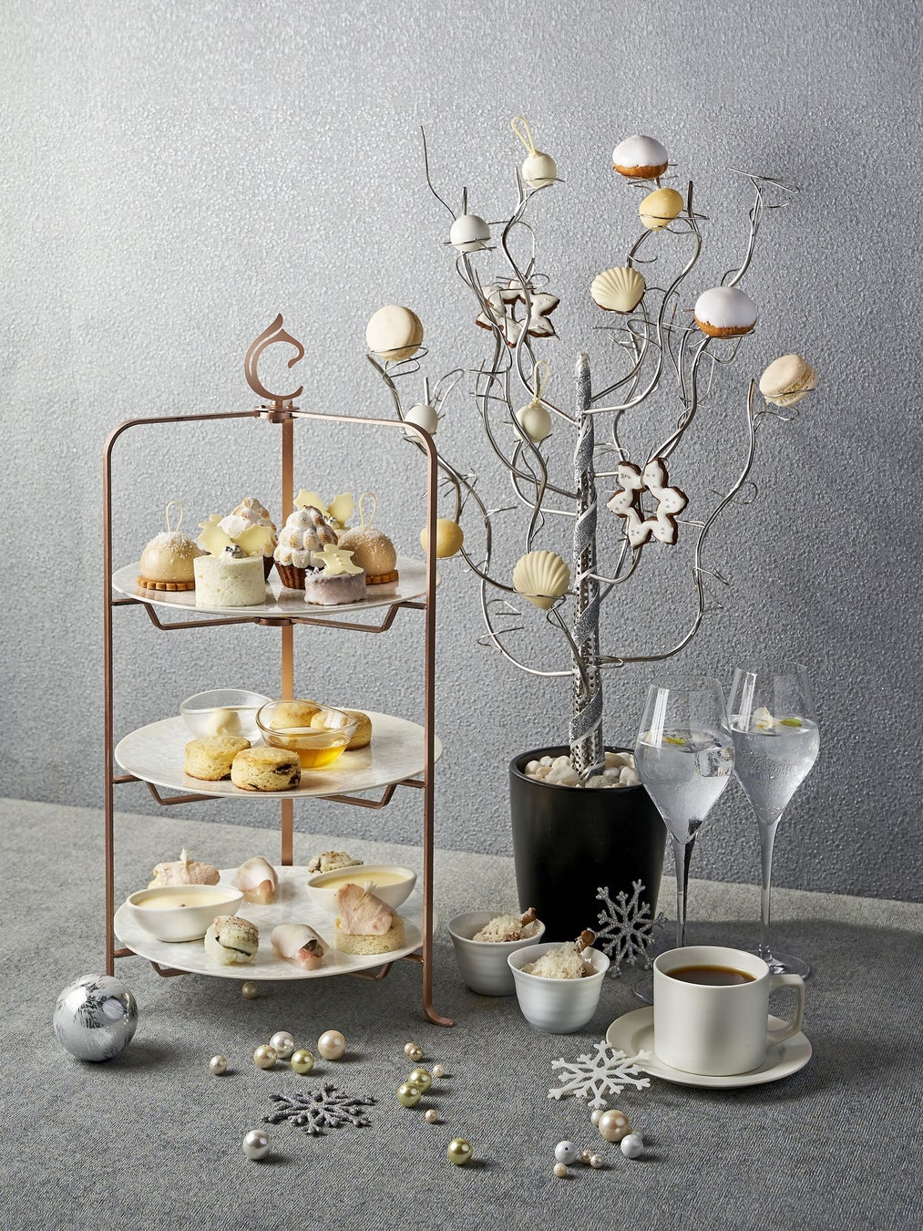 スイーツ狩りが楽しめると好評をいただいているツリー型スタンドもクリスマス仕様で登場します。雪の結晶を模った「スパイスクッキー」、ホワイトチョコでコーティングされた貝殻が可愛らしい「バニラマドレーヌ」、甘酸っぱいカシスとクリームチーズを合わせチーズケーキのような味わいの「オーナメントカシスチーズ」など、写真映え間違いなしの可愛らしいオーナメント仕立てのスイーツが、ツリー型スタンドを華やかに演出します。