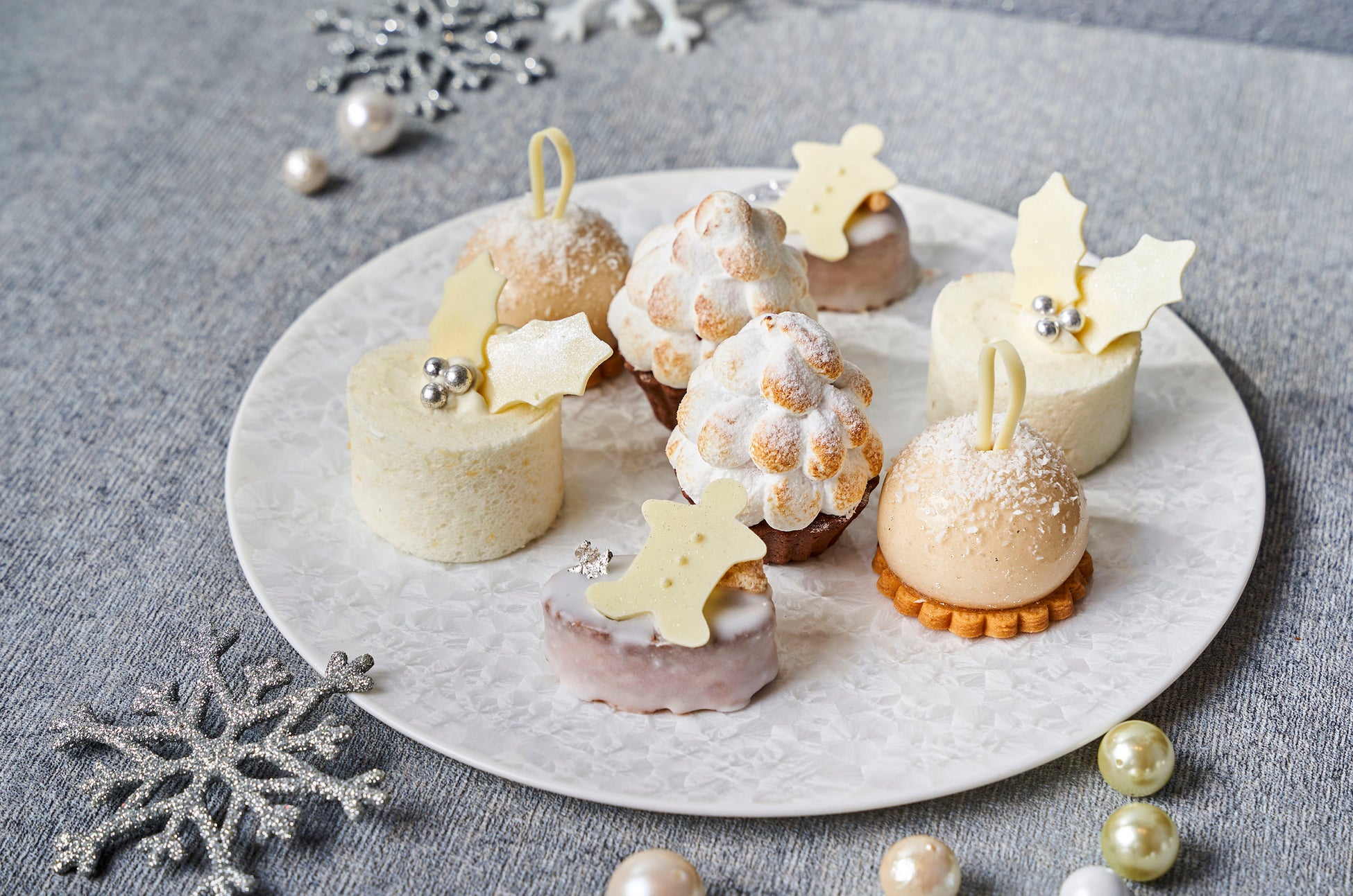 メレンゲ仕立ての白いクリスマスツリーやオーナメント型のムースなど、純白スイーツがラインナップ