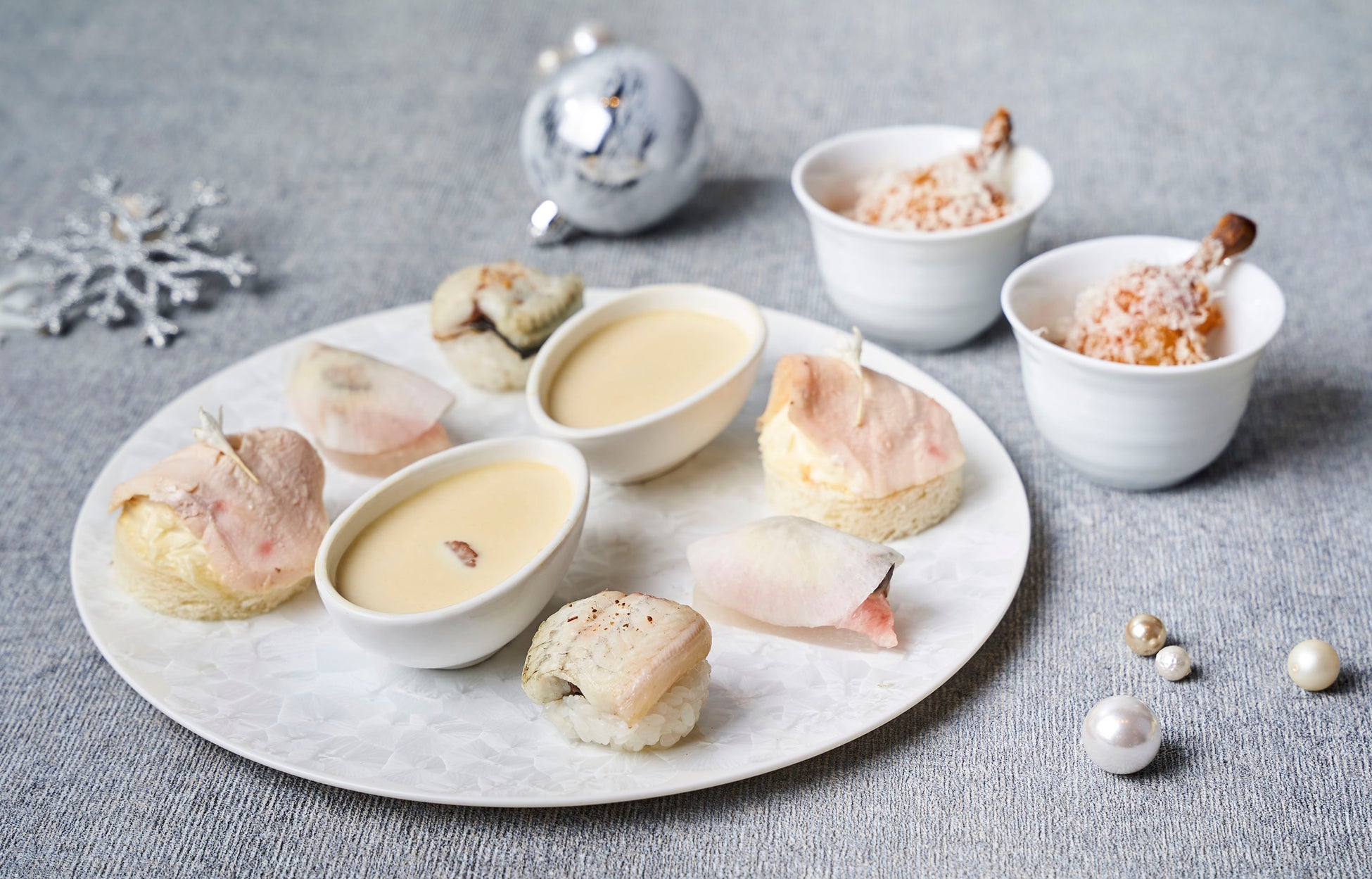 ホワイトブリ大根、白子のフラン、鰻てまり寿司、チキンスモーブロー