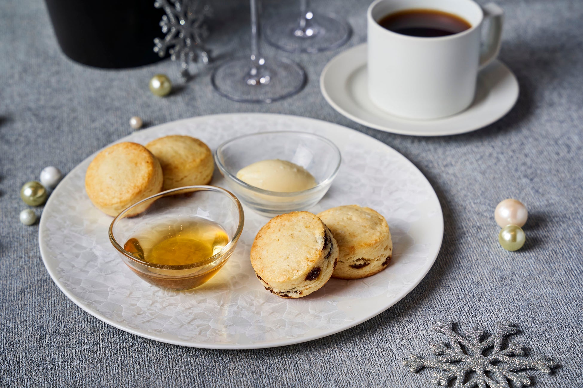 アフタヌーンティーに欠かせないスコーンは、塩ラムレーズンとプレーンの2種類をご用意しました。たっぷりのレーズンとラム酒の芳醇な香り、そしてほんのりソルティな大人な味わいのスコーンは、紅茶との相性も抜群です。クロテッドクリームと蜂蜜をたっぷりとつけて、ティータイムをご堪能ください。