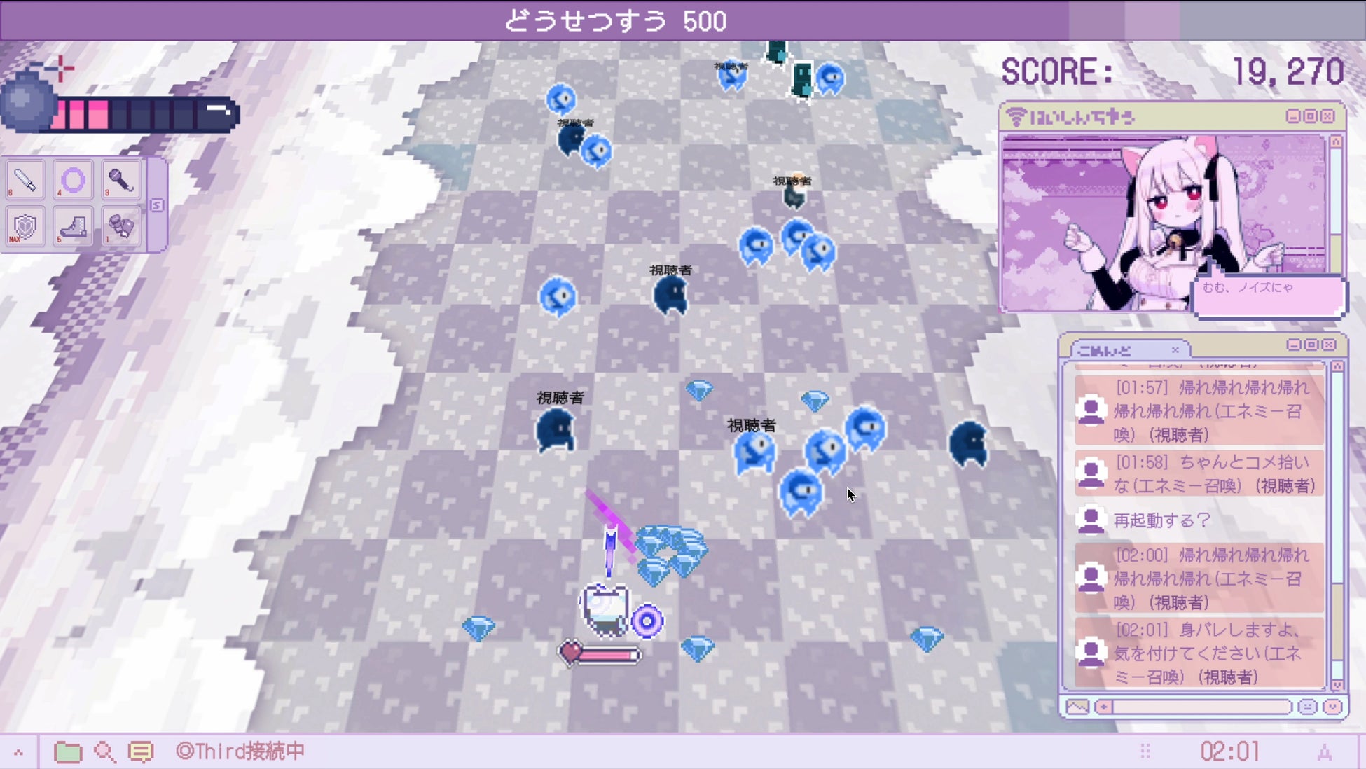 害悪リスナーやアンチが敵として襲いかかる中、画面上を逃げ回りつつスキルで撃破し、ストレス値を正常にせよ!