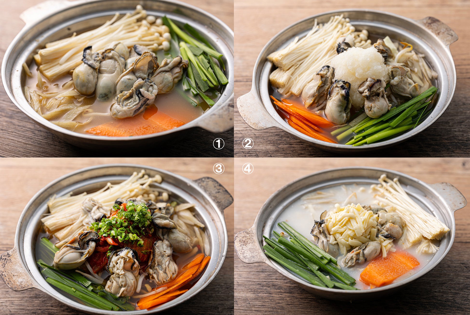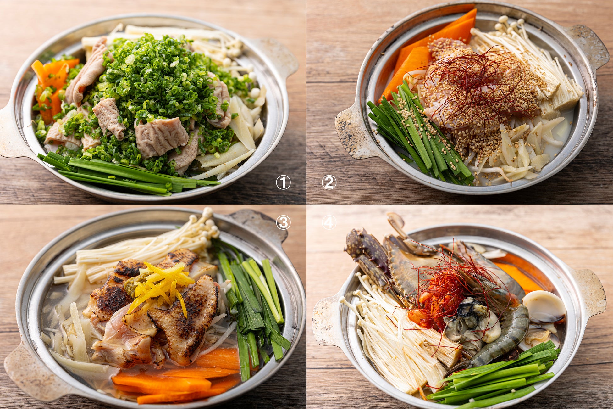 お1人お1人の好みにあった鍋をお楽しみいただくため、今回から1人前より鍋メニュー全10種類の中からご注文が可能になりました。かき・もつのメニューのほか、鶏鍋・海鮮鍋・チゲ鍋など、バリエーション豊富に取り揃えました。一部をご紹介します。