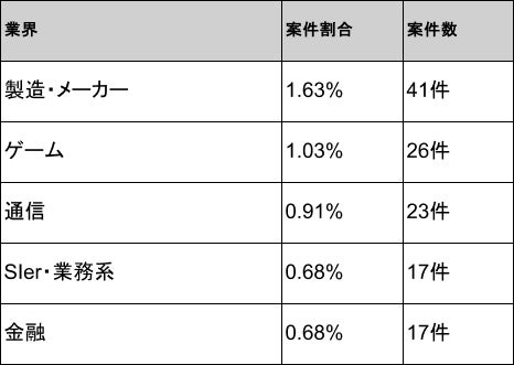 業界別上位は製造・メーカーが1.63%、ゲームが1.03%、通信が0.91%、SIer・業務系が0.68%、金融が0.68%で、リアルタイム制御や長期保守が必須の領域に集中しています。