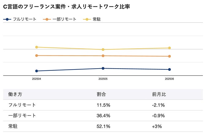 2025年6月時点のC言語フリーランス案件・求人におけるリモートワーク比率は、フルリモートが11.5%、一部リモートが36.4%、常駐が52.1%です。フルリモートは前月比-2.1%、一部リモートも-0.9%縮小しましたが、常駐は+3%増加しています。