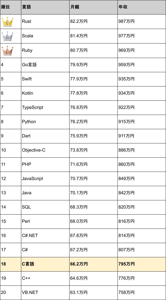 C言語案件の平均月額単価は66.2万円、平均年収は795万円で年収ランキング18位です。C言語はUNIXとともに誕生した歴史ある手続き型言語で、ポインタ操作と高速実行が強みです。