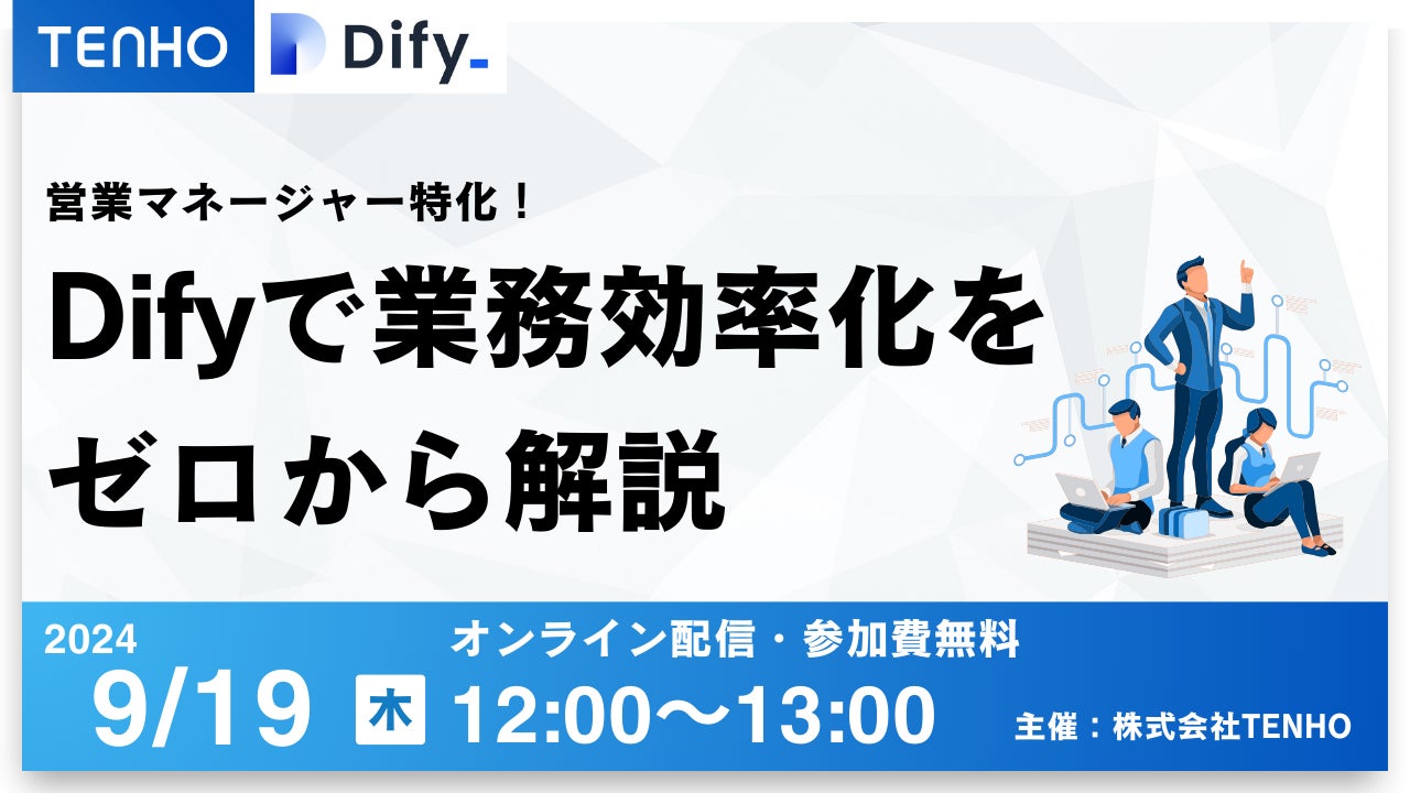 生成AIに関する研修事業を展開する株式会社TENHO(本社:東京都渋谷区、代表取締役:田村 允)は、2024年9月19日(木)12:00〜13:00に第3回無料ウェビナー「【営業マネージャー向け】ゼロからDifyで業務を効率化する方法」を開催します。営業チームの生産性を劇的に向上させたい営業マネージャーに向けた内容で、営業マネジメントに特化したDify活用方法を徹底解説します。今回も前回同様、デジタルシティ株式会社(本社:東京都渋谷区、代表取締役:大島 予章)との共催になります。