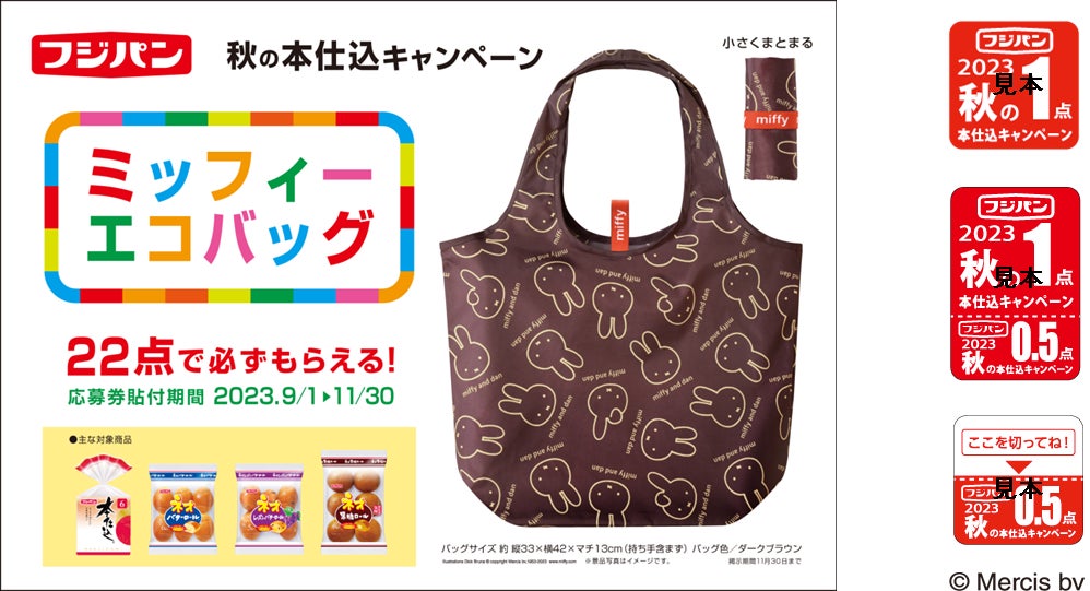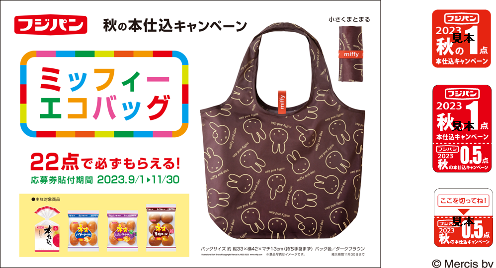 フジパンでは、2000年頃からキャンペーンの景品として『バッグ』の配布を開始し、お客様の日常のお買い物のシーンにご活用いただいております。2023年の「ミッフィーエコバッグ」の仕様は、小さくまとまりコンパクトに持ち運びが出来て、お買い物バッグや普段使いのサブバッグなど様々なシーンでお使いいただけます。ダークブラウンの落ち着いた色味に2020年に好評だったミッフィーとダーンの総柄を採用し、大人かわいいデザインとなっております。応募方法は、対象商品についている応募券22点を一口として、応募ハガキまたは市販ハガキに貼り、必要事項を明記の上、郵送にてご応募いただきます。もれなく「ミッフィーエコバッグ」を1個プレゼントいたします。