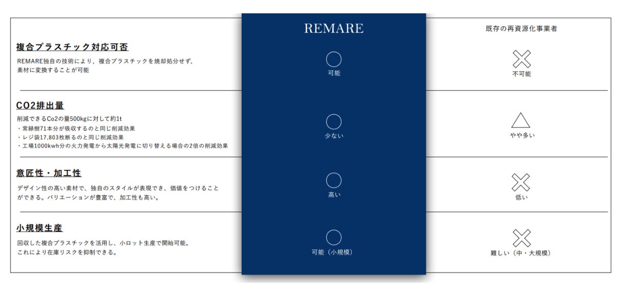 REMAREは、Scope3分野におけるCO2削減に直結する、廃棄複合プラスチックのマテリアルリサイクルに注力しており、これまで多くの企業との間で実績を積み上げてきました。