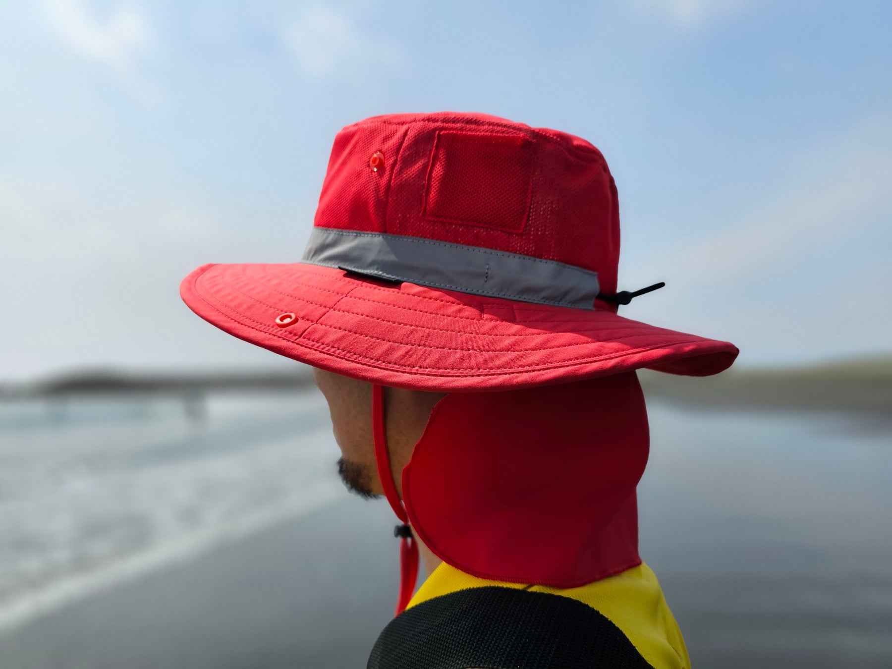 サイドのスナップボタンでつばを固定することで、レスキューボードに乗った状態など視点が低い場面でも、視界をしっかり確保できます。