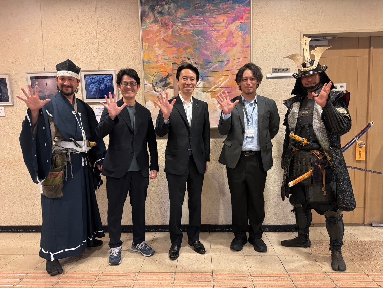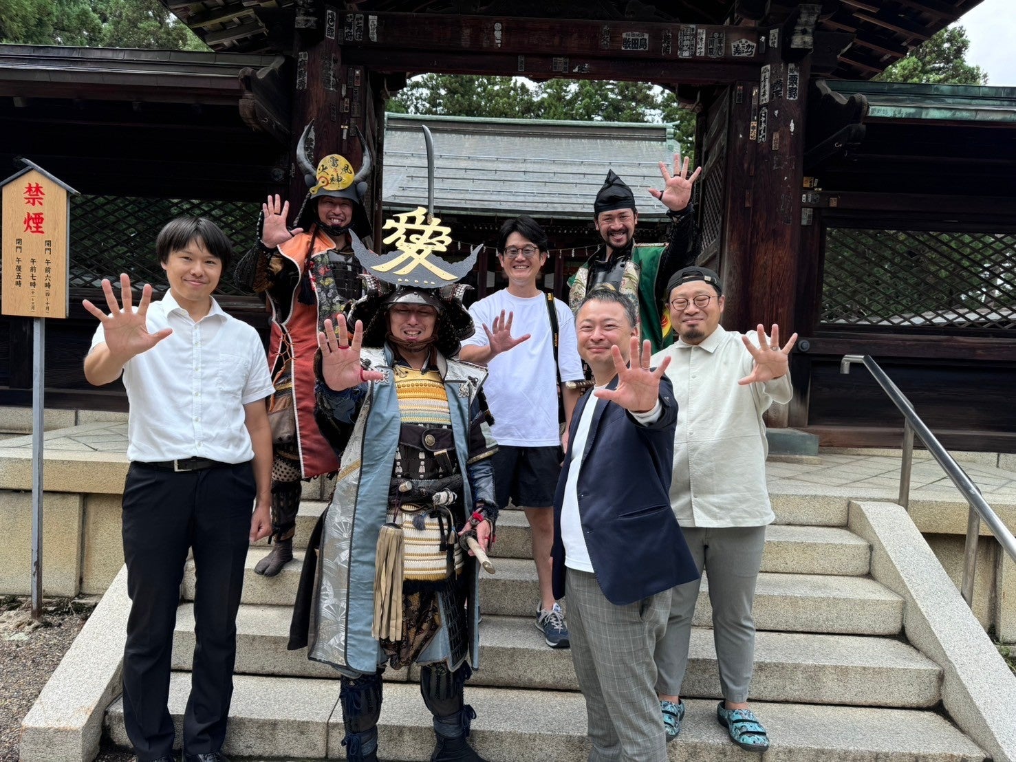 ■クラファンチームで上杉神社にて花火が開く様子を表したポーズで写真