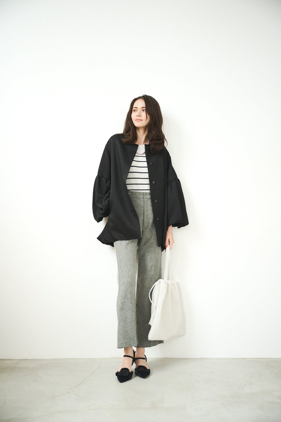 [ジャカードバルーンアウター ¥39,600(エクリュ、ベージュ、ブラック)]