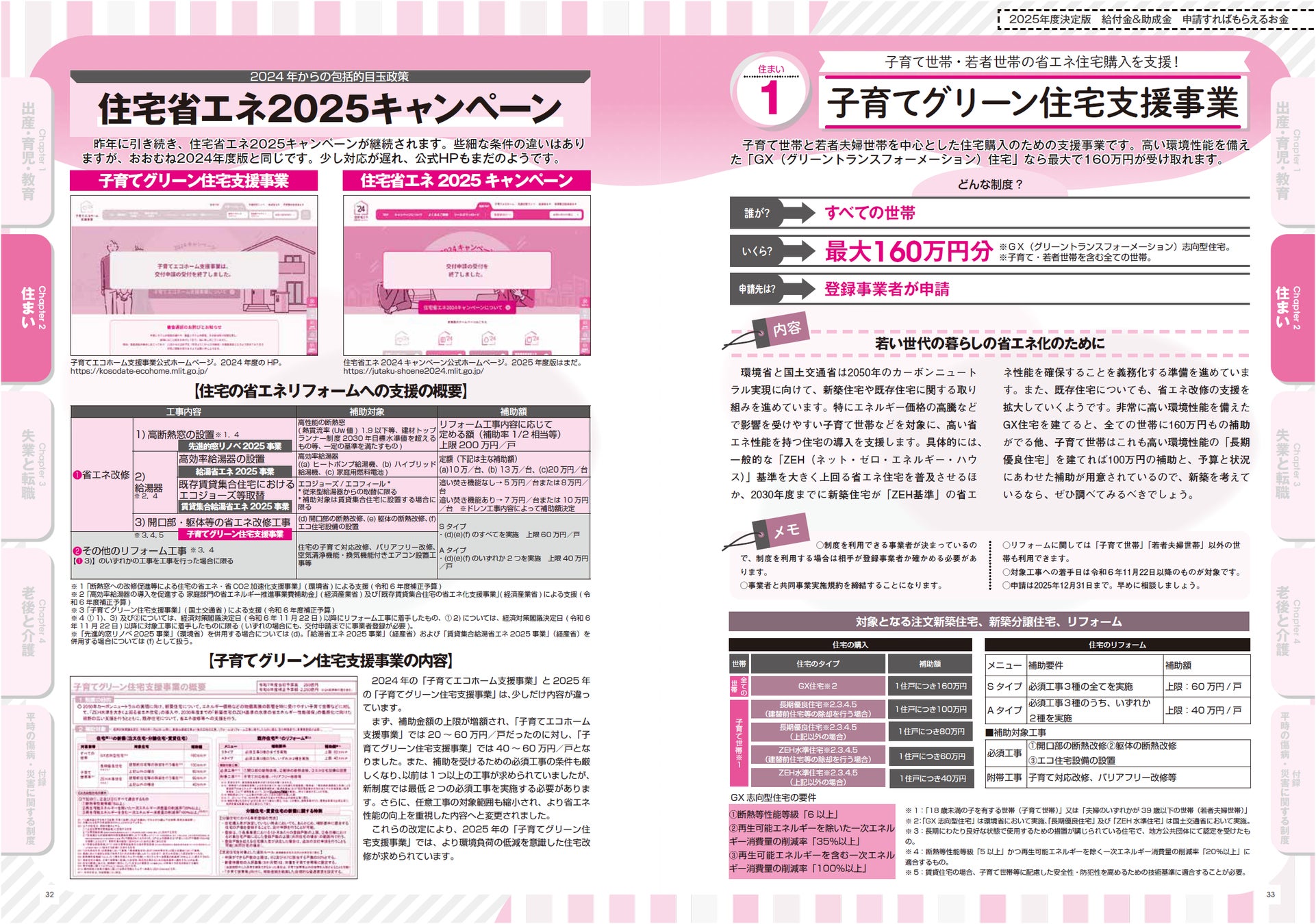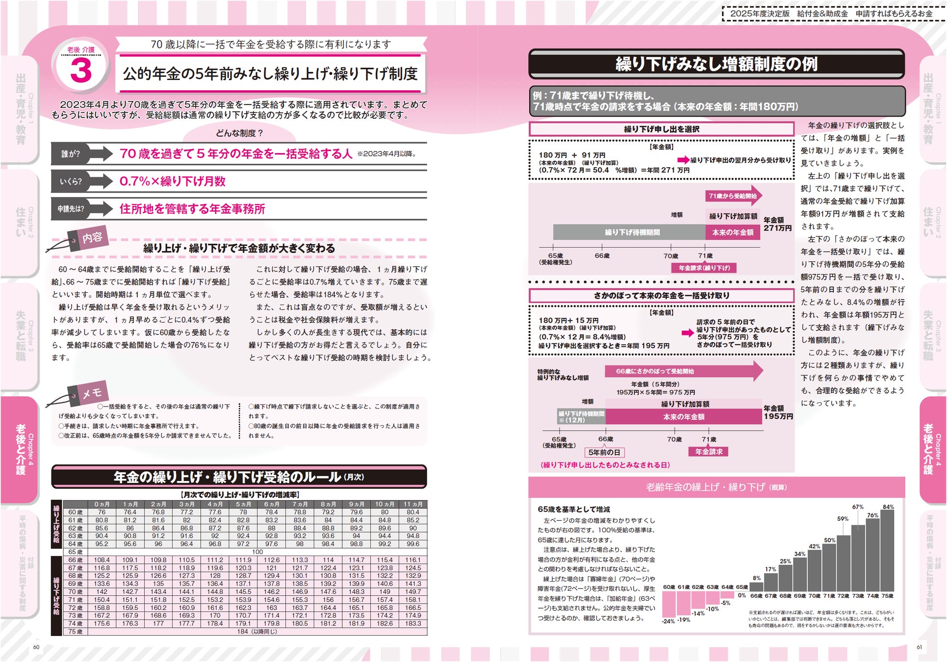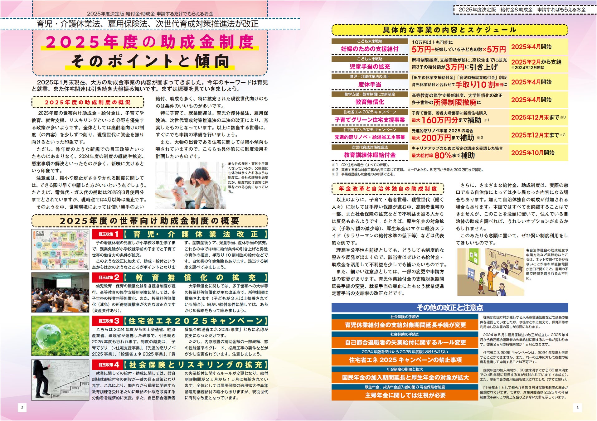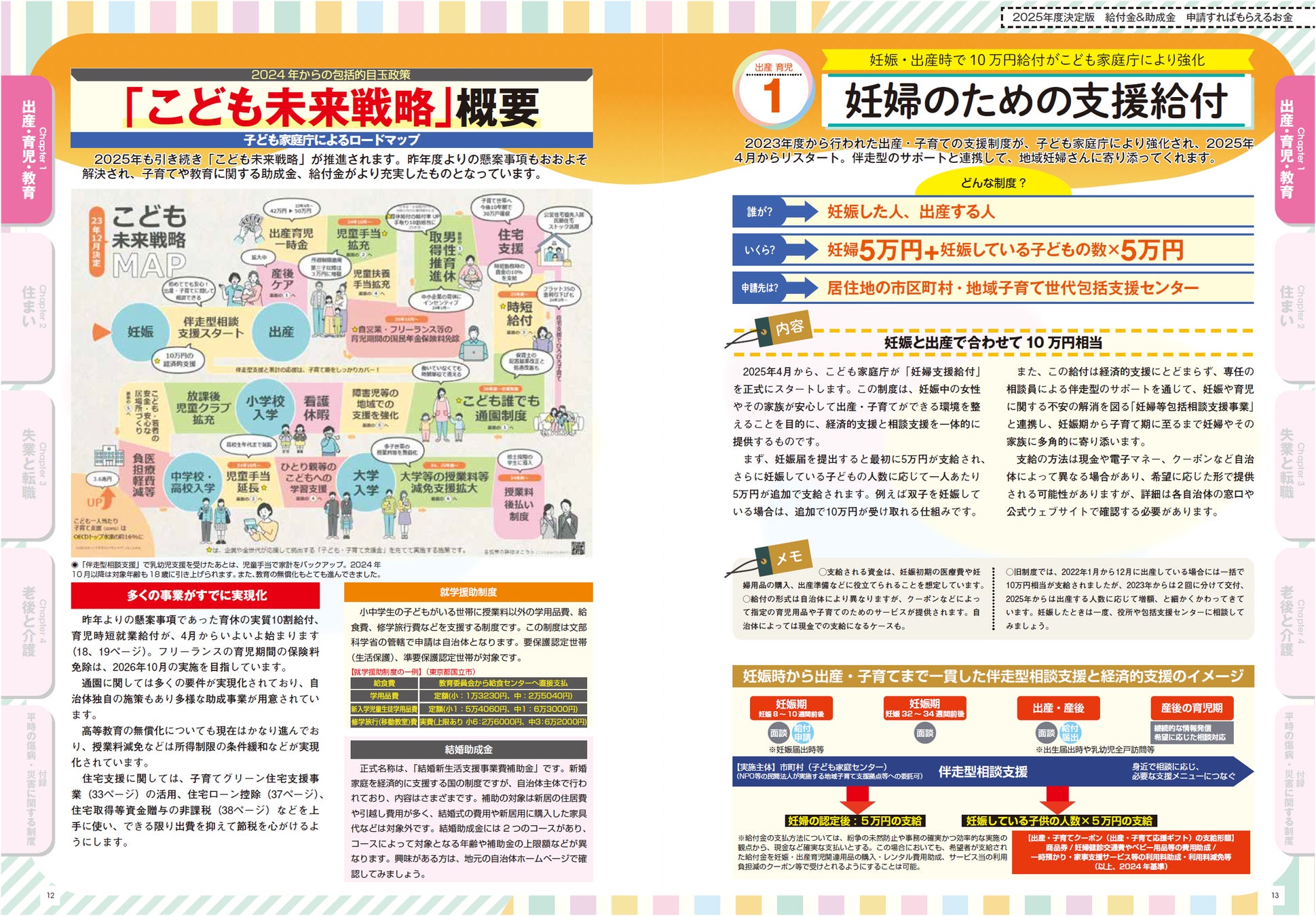 第1章「出産・子育て・教育」では、子を妊娠した時から大学を卒業するまでの給付金・助成金のすべてを取り上げました。特に今年の目玉は「育児介護休業法、雇用保険法、次世代育成対策推進法の三法の改正」で、2025年4月から新たに「出生後休業支援給付金」と「育児時短就業給付金」の2つが創設されました。育休時の実質10割給付から夫の育休促進までおトクな内容となっています。「妊婦のための支援給付」も拡充され、10万円の基本からさらに双子などで上乗せされるようになります。教育無償化では、一部所得制限が撤廃されました。
