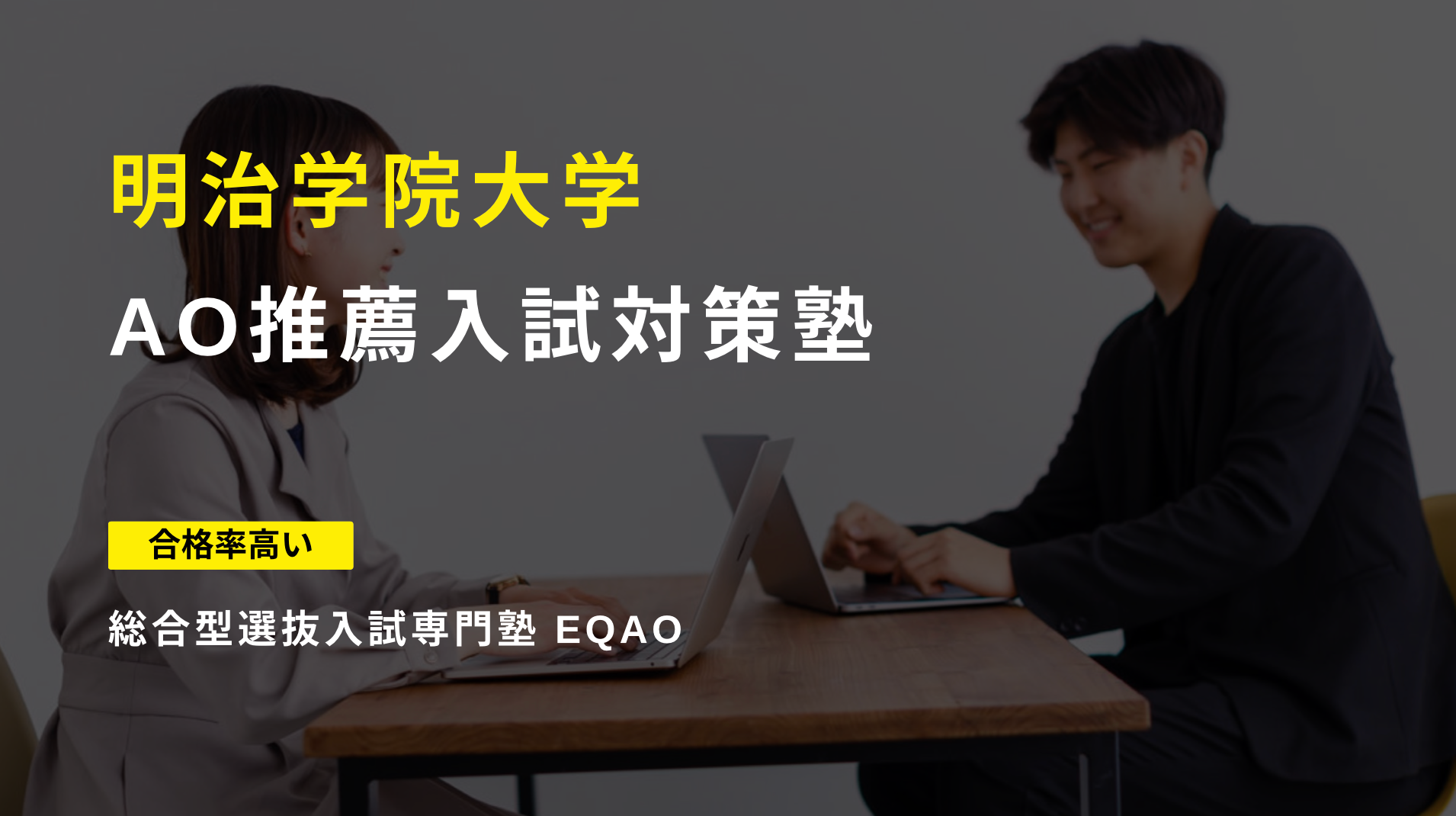 総合型選抜入試専門塾EQAOの明治学院大学の合格率は100%。明治学院大学の自己推薦AO対策に精通したプロ講師/塾長と対談可能です。推薦入試で明治学院大学に合格するならEQAO。【明治学院大学特化】