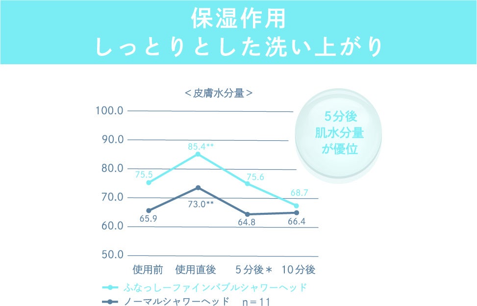 【洗い上がりはしっとり】…通常のシャワーヘッドと比べて、5分後の肌水分量が優位(※7)になり、しっとりとした洗い上がりです。