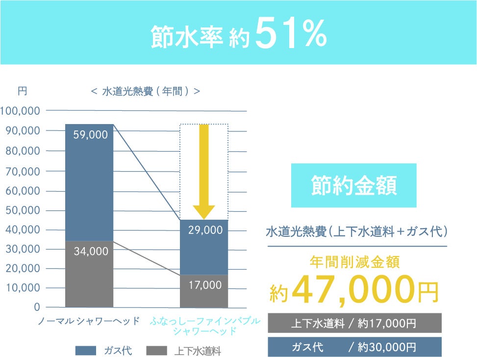 通常のシャワーヘッドと比べて、最大節水率は約51%(※1)。毎日つかうシャワー水流でしっかりと節水いたします。お湯を沸かす光熱費の節約にも繋がり、年間約47,000円(※2)の節約効果があります。